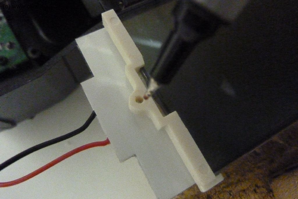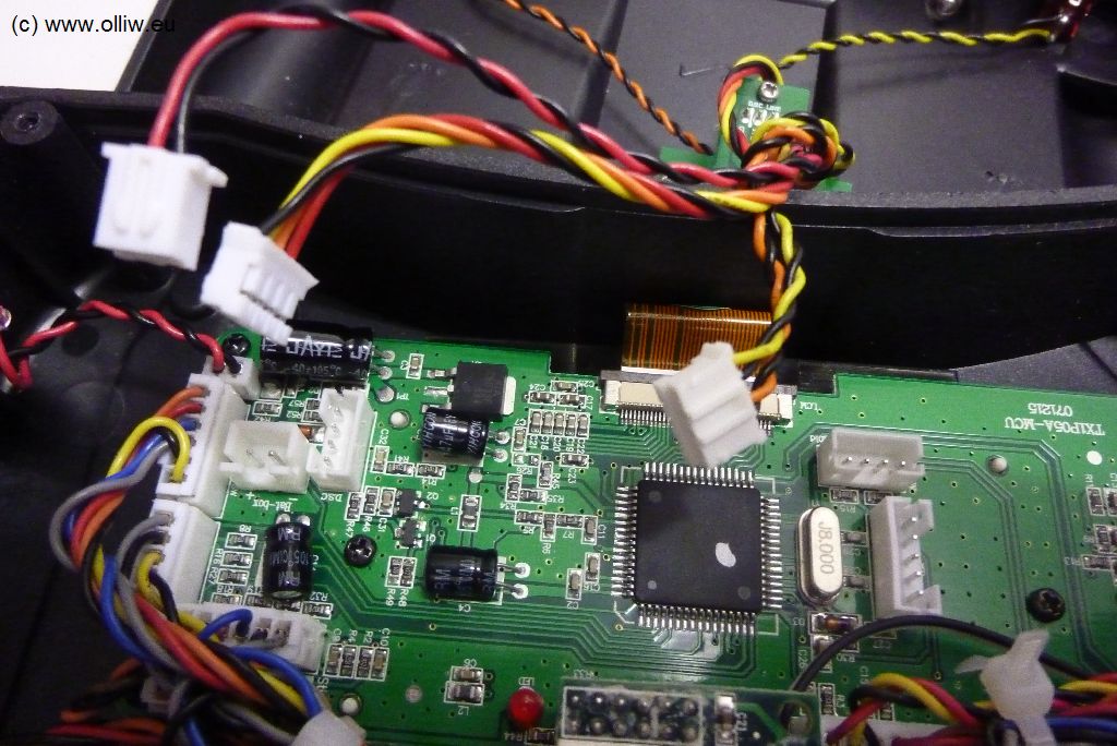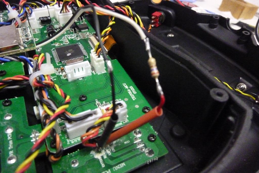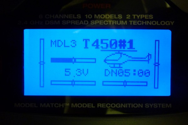 Als Vorwiderstand habe ich übrigens einen 270 Ohm Widerstand eingebaut. Der Strom ist dann kleiner als 10 mA (bei 5.3 V sind’s 8.9 mA). Es geht vermutlich mehr (auf der Hobbyking-Webseite steht ja etwas von 60-90 mA), aber mir persönlich reicht die Helligkeit so bei Weitem aus; im Sonnenschein muss ich die Hintergrundbeleuchtung nicht sehen. Und wie zu erkennen schalte ich das Display über den Hauptschalter der Dx6i ein, es ist also immer an. Vielleicht wird die Betriebszeit dadurch etwas kürzer, aber dass ist es mir wert.