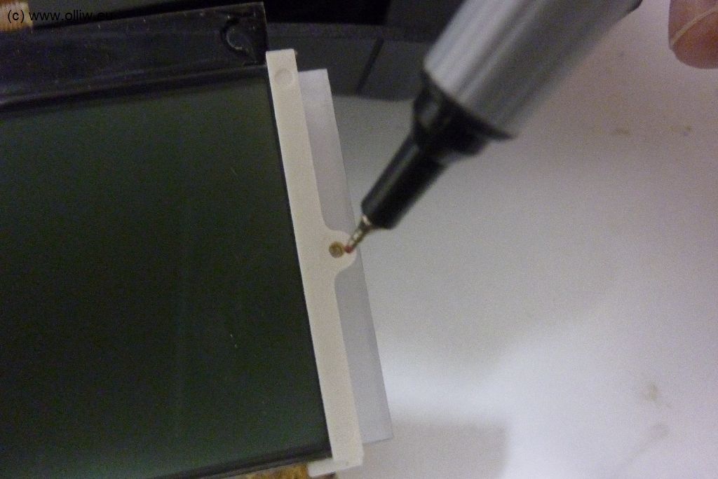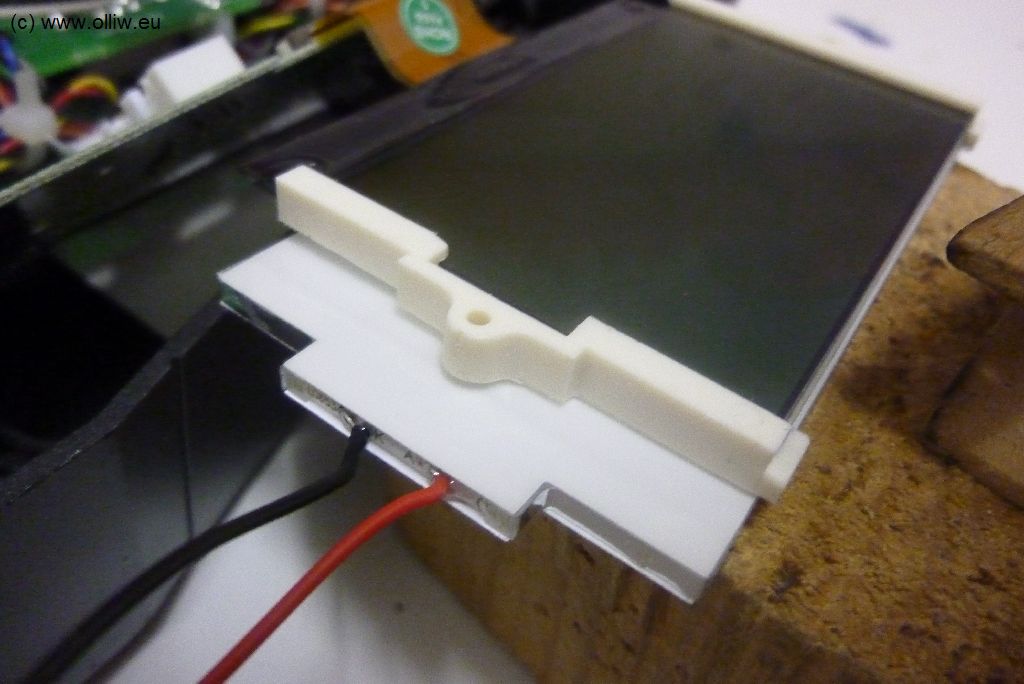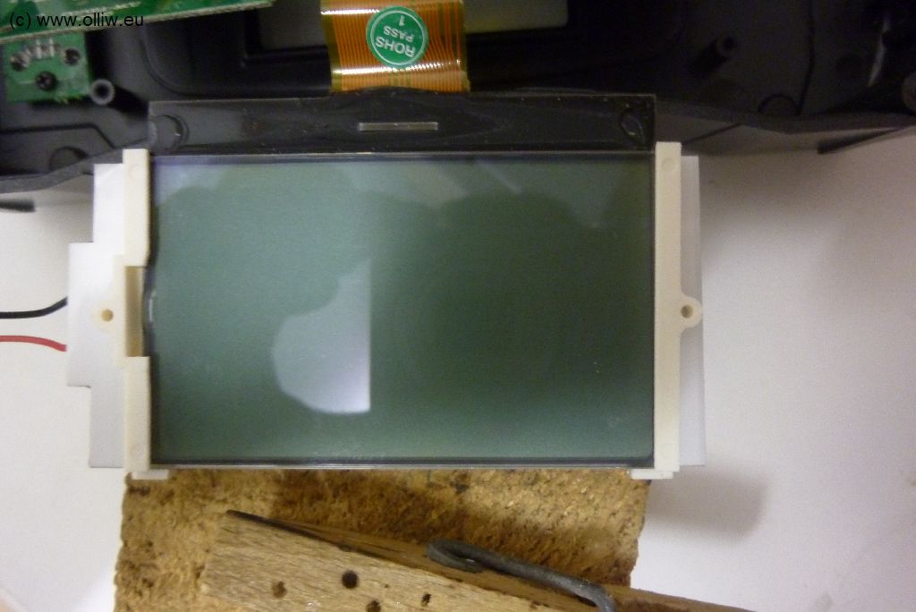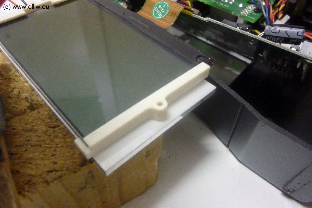 Der größte Schönheitsfehler des Umbaus ist es aber vielleicht, dass nicht das gesamte Display ausgeleuchtet wird. Links würde das schon gehen, aber rechts nicht, da sich da der Bereich befindet in dem die Leds untergebracht sind. Vielleicht müsste man die originalen LCD-Display-Halter noch weiter bearbeiten, und einfach zwei Löcher für die Befestigungsschrauben durch das LED-Backlight hindurch bohren und so das LCD-Display festhalten… könnte gehen, und würde vermutlich ein „perfektes“ Resultat ermöglichen… aber wie gesagt, vielleicht ein Andern mal.
