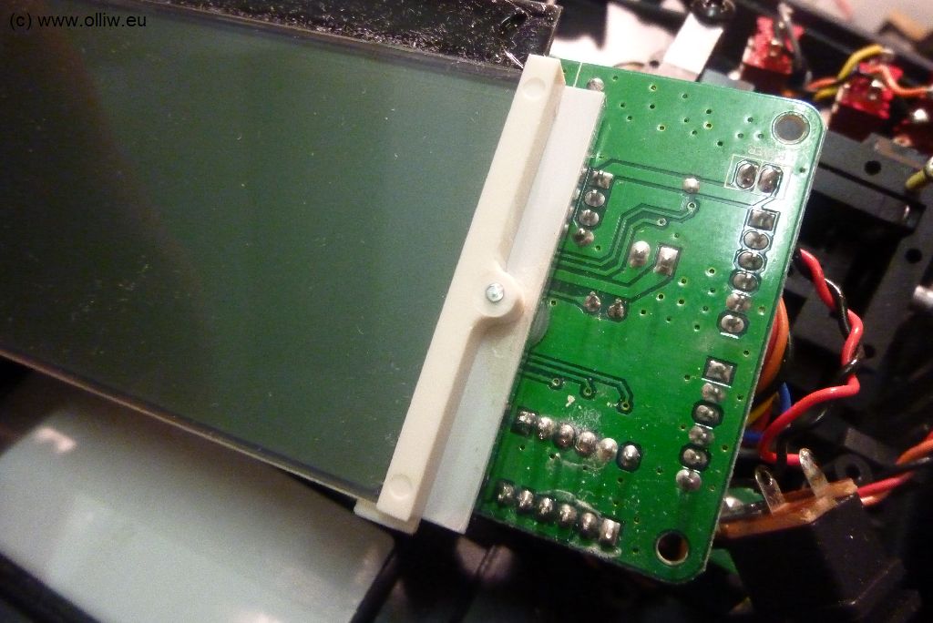 Die grundsätzliche Idee war, die ursprünglichen LCD-Halter dünn zu sägen, und das ganze Sandwich aus Platine, LED-Backlight, und LCD über Löcher durch das LED-Backlight für die Verbindungschrauben zusammenzuhalten. Das ist mechanisch alles sehr einfach zu gestalten, jedenfalls viel einfacher als das mühselige Kleinschneiden des LED-Backlights etc. im ersten Umbauversuch. Da auf der Platinenrückseite die Lötfüßchen sind, schmiegt sich das LED-Backlight nicht richtig an, und beim Zusammenschrauben würde sich die Platine durchbiegen. Das wurde mit Plastikunterlegscheiben zwischen Platine und LED-Backlight gelöst. Damit lässt sich das ganz recht gut und fest zusammenschrauben. Aber die Platine als Ganzes steht nun natürlich zu hoch, d.h., die vier Schrauben an den Ecken welche die Platine mit dem Gehäuse verbinden dürfen KEINESFALLS voll angezogen werden, da sich sonst die Platine durchbiegt, und wer weiss, vielleicht gar Leiterbahnen reißen. Man könnte hier wieder passende Unterlegscheiben oder Abstandhalter aus Plastik benutzen. Ich habe an dieser Stelle aber darauf verzichtet und habe die Schrauben gerade so angezogen, dass es hält ohne groß durchzubiegen. Mir sitzt das so fest genug (wer schmeißt schon seine Funke gegen Wände oder dergleichen).