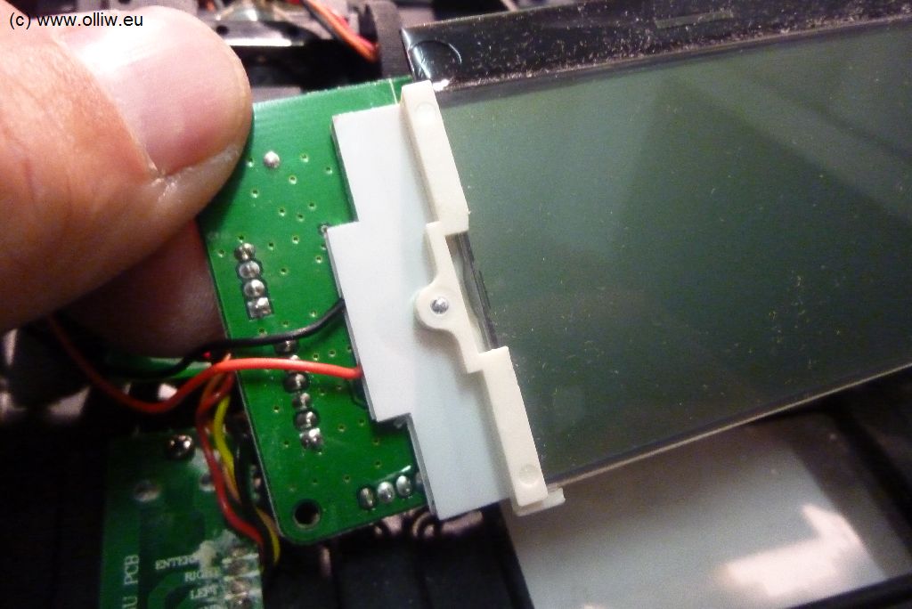 Das LED-Backlight ist eigentlich auch zu dick um es passgenau unter das LCD-Display zu schieben, daher steht nun alles ein bischen ab (innen!, sieht man aussen nichts von). Man sollte daher die Schrauben KEINESFALLS voll anziehen, da sich sonst die Platine durchbiegt, und wer weiss, vielleicht gar Leiterbahnen durchreißen. Idealerweise nimmt man da passende Unterlegscheiben (aus Plastik). Ich habe aber darauf verzichtet, und habe die Schrauben gerade so angezogen, dass es hält ohne groß durchzubiegen. Mir scheint das so fest genug zu sitzen (wer schmeißt schon seine Funke gegen Wände oder dergleichen).