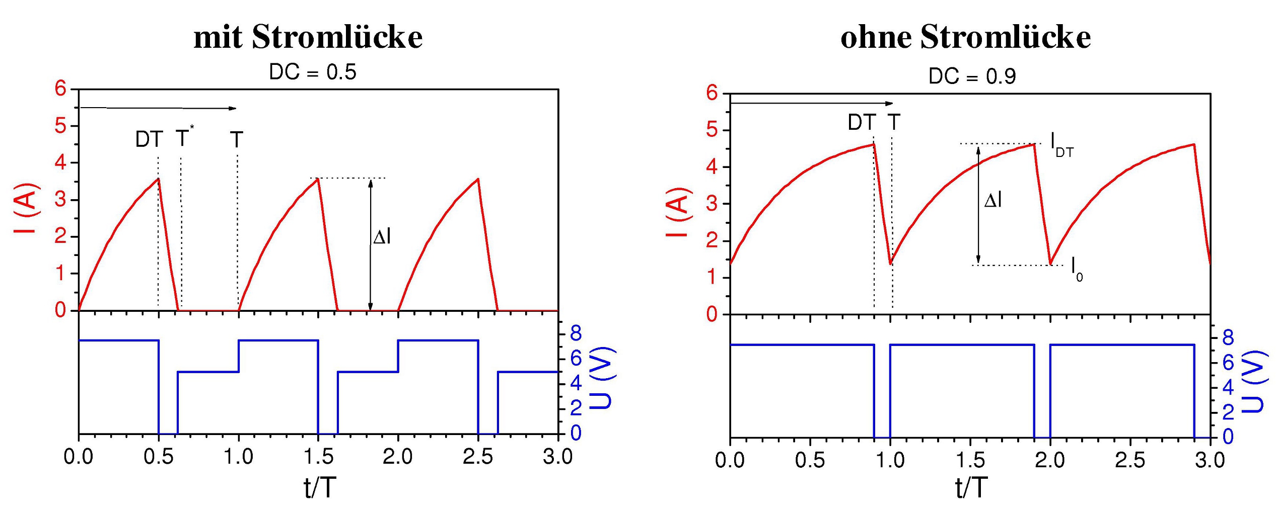 Eine Stromlücke tritt tendenziell bei großen Drehzahlen, kleinen Lasten bzw. Strömen, und/oder großen Taktverhältnissen auf.