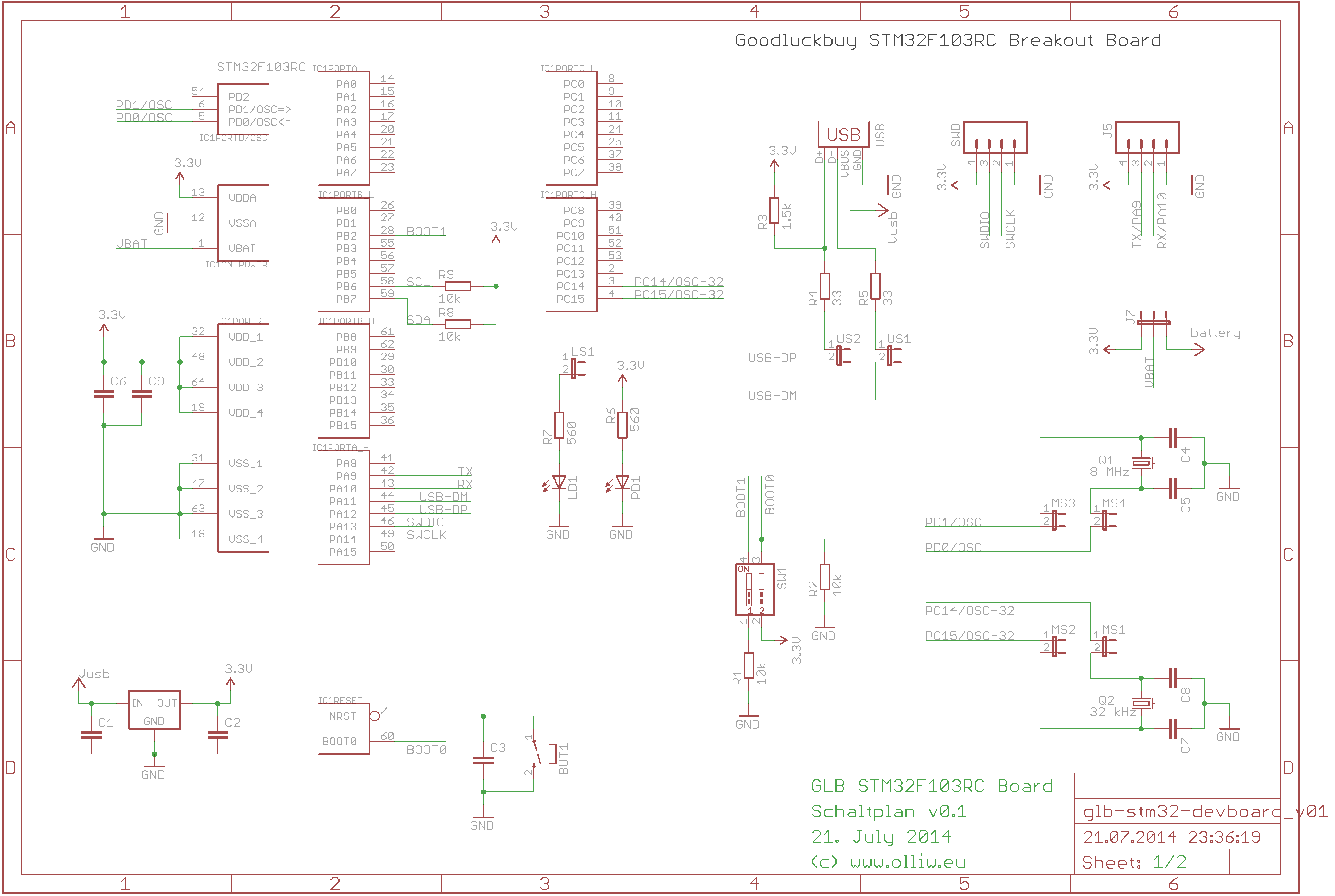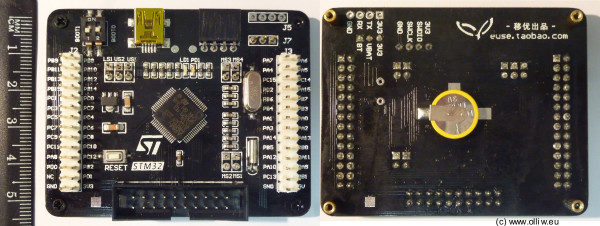Das ist das einzige mir bisher bekannte günstige Board mit einem F103RC Prozessor, und es ist nicht schlecht: Es hat alles on-board was man braucht (inklusive einer 3 V Batterie) und die Pins sind beschriftet. Es ist allerdings nicht gerade sehr klein, dafür aber billig.