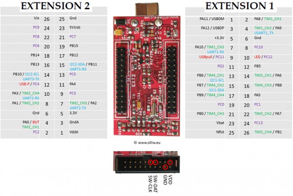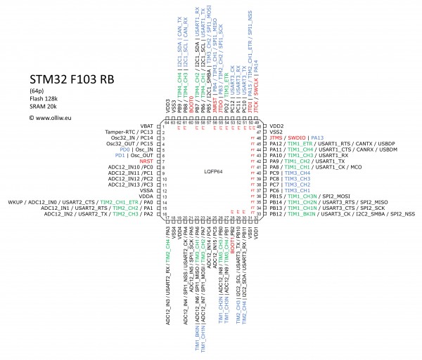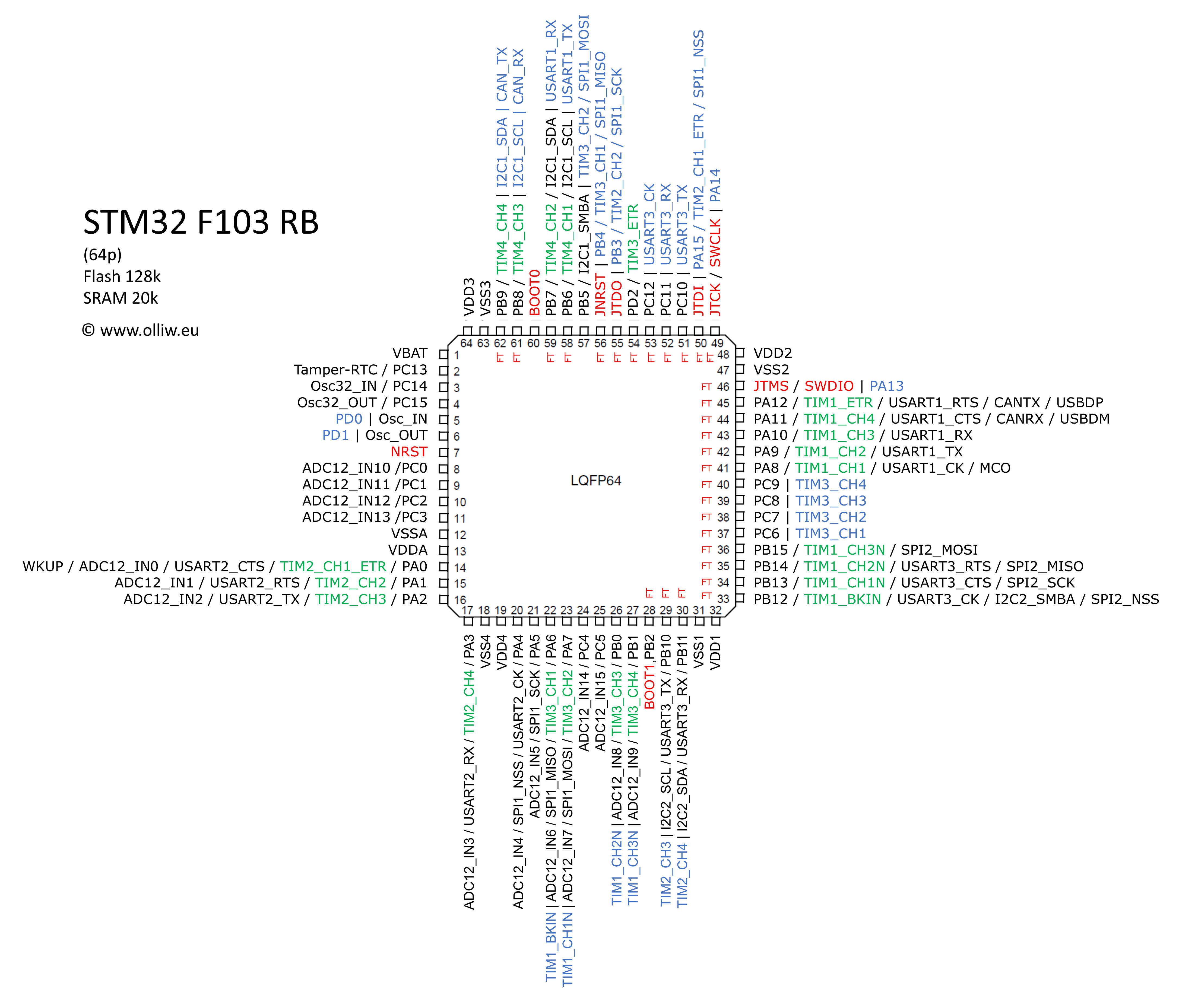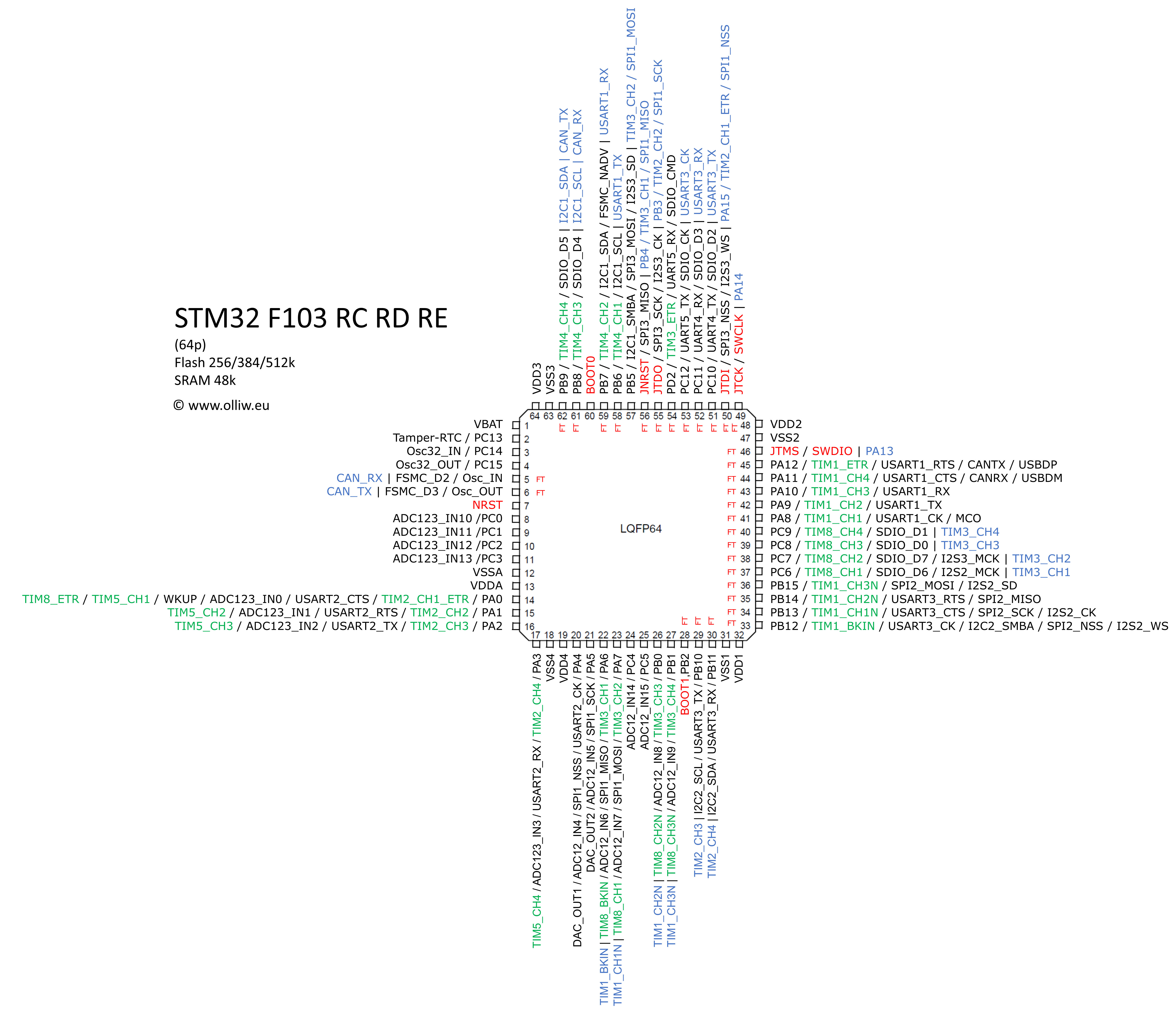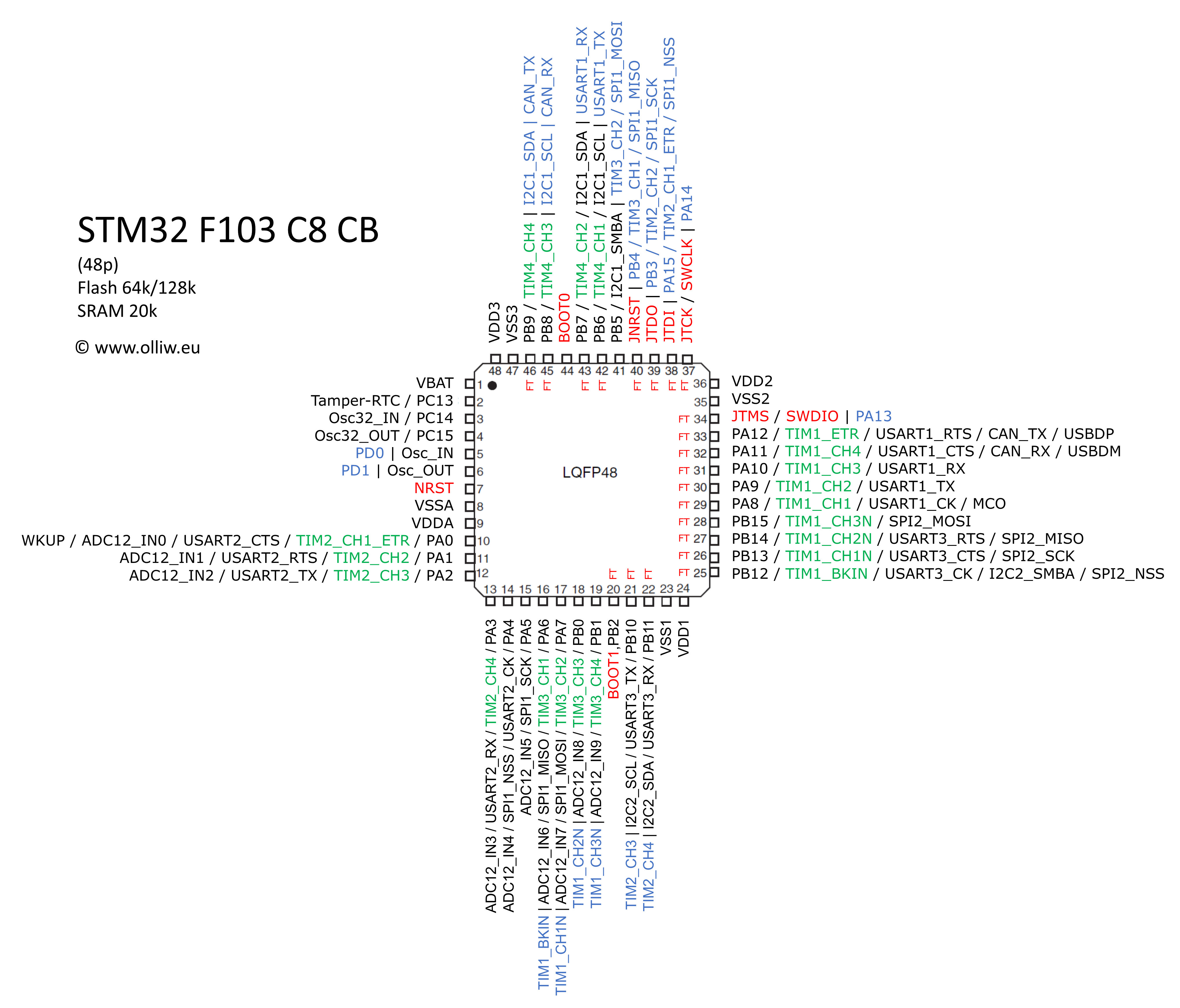 Am Anfang fand ich die Pinzuordnung bei den STM32 Chips ziemlich verwirrend, vorallem weil das Datenblatt nur eine Liste der Pins mit den Funktionen anbietet, und weil einige der Funktionen auf alternative Pins umgeleitet werden können. Zur besseren Übersicht erstellte ich mir daher einige Dokumente, die ich extrem nützlich finde, und daher unten zur Verfügung stelle.