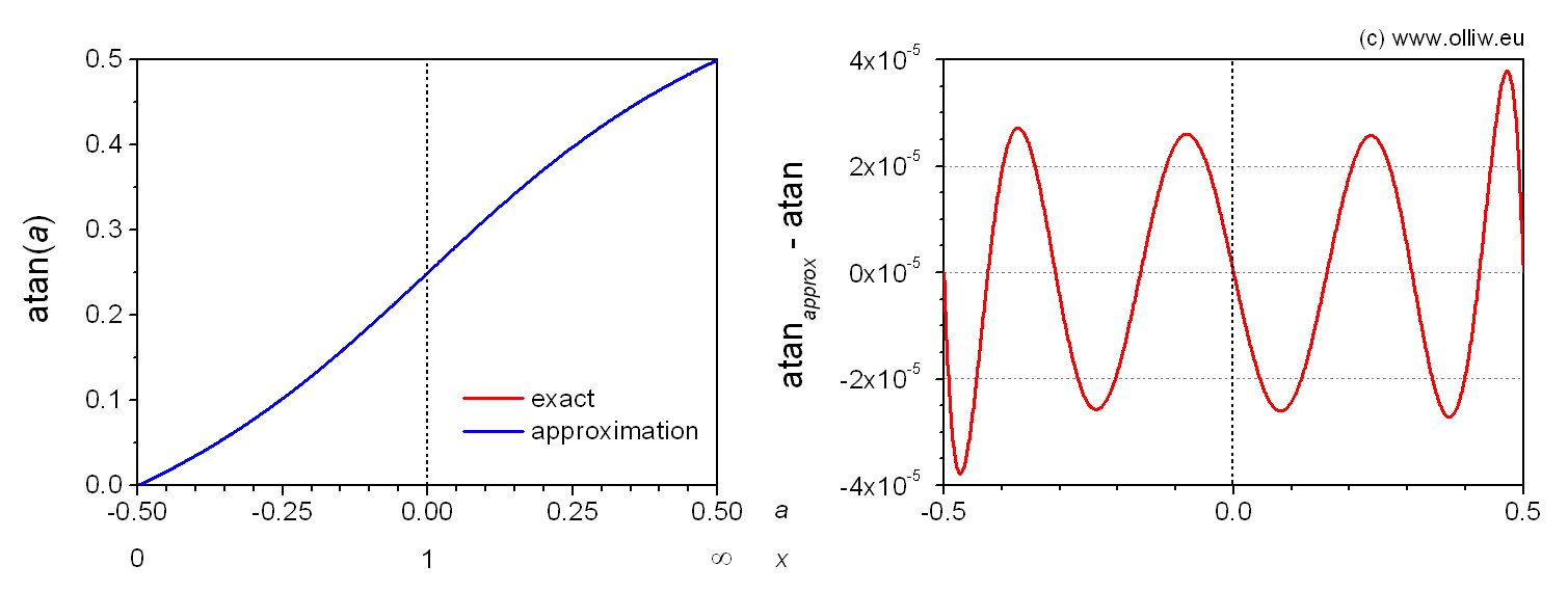 2) The above functions can all be done with CORDIC. However, besides being renowned for being slow, a major obstacle is IMHO its irregular error behavior. This leads to substantial noise in e.g. calculated derivatives, needed in PID controllers. It was hence clear to me from the outset that only polynomial approaches (such as polynomial approximation, Chebyshev approximation, minimal polynom, rational approximation, Pade series, Taylor or Laurent series expansion) come into question, since their error function is smooth. Then the relative precision is much higher than the absolute accuracy. In addition, the STM32 core provides single-cycle multiplication, and calculating polynomials is very fast. For this reason also look-up tables were not considered, since in the time two data points are loaded from memory many multiplications may be done.