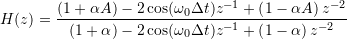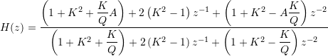 The discrete-time transfer function can be expressed in many equivalent ways, which differ in how the biquad coefficients are parameterized. In fact, quite many different parameterizations can be found on the web, too many to be all discussed here. Most of these equations are obtained from discretizing the continous-time transfer function using the bilinear transformation.
