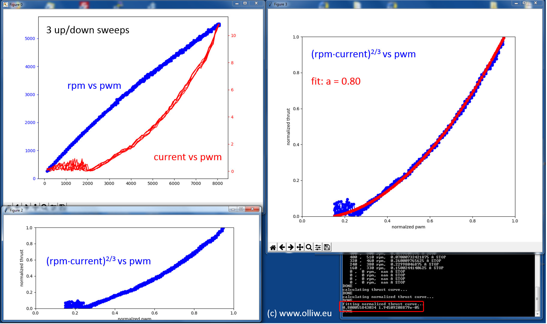 A Python script, making use of the PyUavcan library, controls the whole procedure (the script is available here): It ramps up and down the motor, e.g. three times, collects the telemetry data and plots them out, and finally uses the data to apply a fit to determine the MOT_THST_EXPO value, which is ArduPilot’s parameter for the internal thrust compensation.