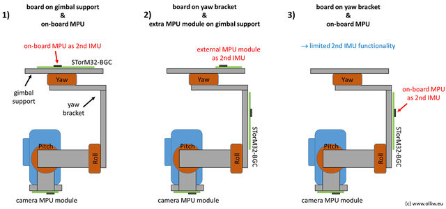 So you can either mount the controller board on the gimbal support using the on-board IMU as 2nd IMU, or put the controller board somewhere else (on the yaw axis for example) and mount an external IMU module above the yaw motor. These two options are shown as option (1) and (2) in the diagram below.
