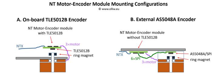 For mounting NT Motor-Encoder modules and encoders, two styles are supported: First, the encoder chip could be soldered onto the NT Motor-Encoder module itself. Alternatively, the encoder chip can be externally installed, in which case the encoder has to be connected via SPI to the NT Motor-Encoder module. The common encoders are the TLE5012B or AS5048A encoders. Also resistive rotary encoders (potentiometers) are supported, but this is mostly for specialized applications. The two mounting styles are shown in this sketch: