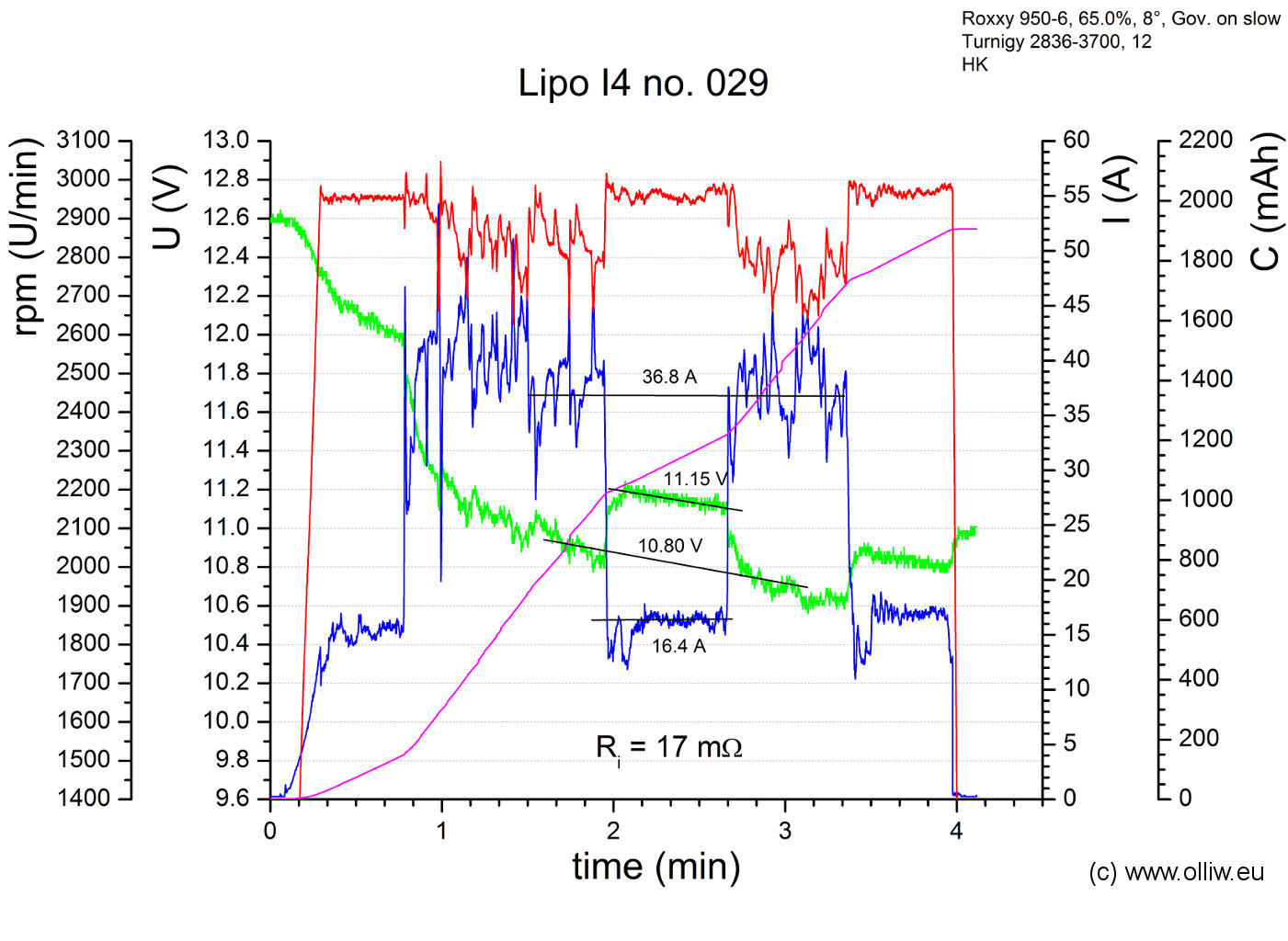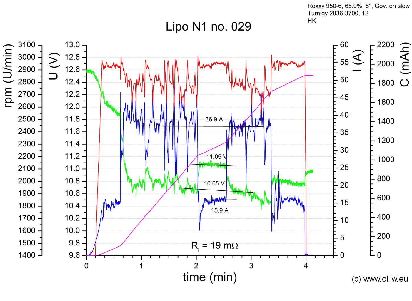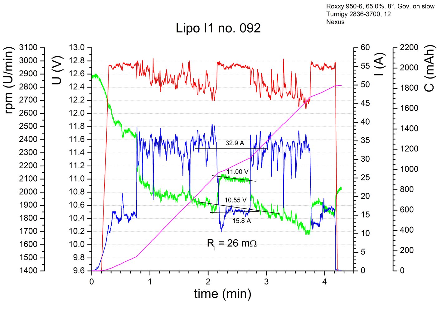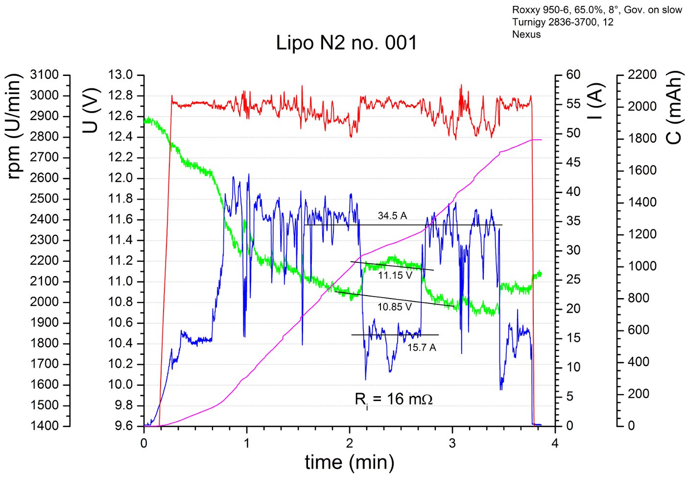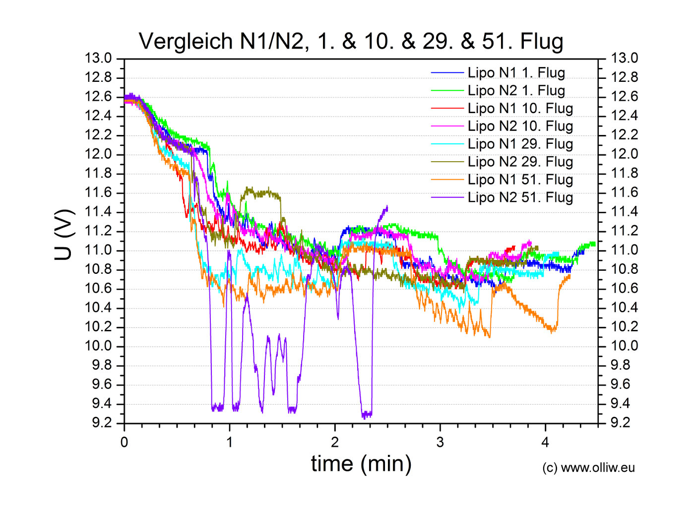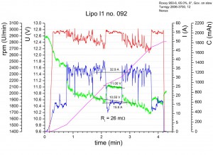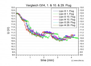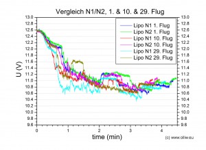 Wenn sich die beiden Lipos eines Pärchens in meinen Augen ähnlich verhalten, was ich denke der Regelfall sein wird, dann werde ich nur die Flugdaten eines Lipos zeigen. D.h., solange ich nicht explizit etwas anders sage, halte ich die gezeigten Ergebnisse für das Pärchen repräsentativ.