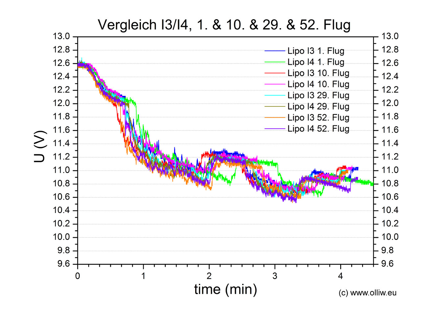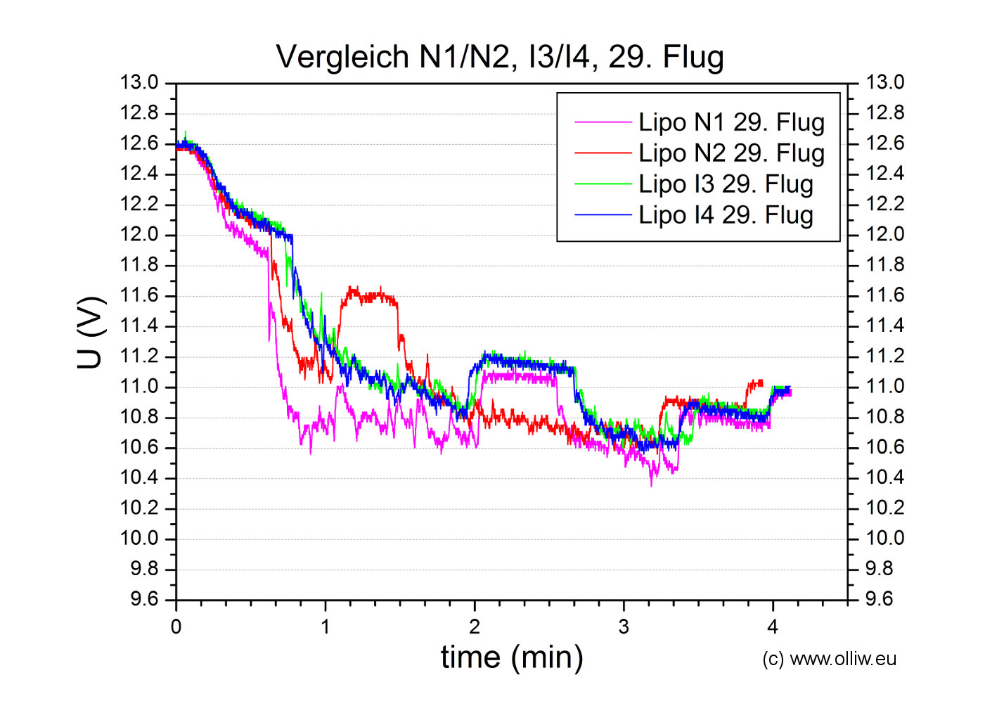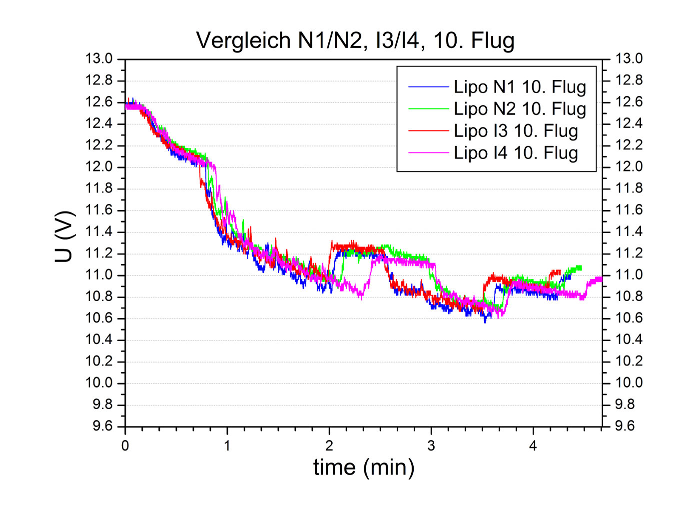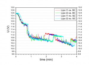 Zum Abschluss dieses ersten Eintrags möchte ich noch einen Vergleich der Spannungslagen für jeden Lipo des I1/I2 Pärchen für jeweils zwei Flüge zeigen. Die Ähnlichkeit der vier Messkurven ist offensichtlich, insbesondere auch im Hinblick auf den deutlichen Unterschied zu den Spannungskurven der neuen Lipopärchen, wie sie oben gezeigt wurden. Diese gute Reproduzierbarkeit deutet (hoffentlich :)) an, dass das gewählte Testverfahren sinnvolle Resultate liefern wird.