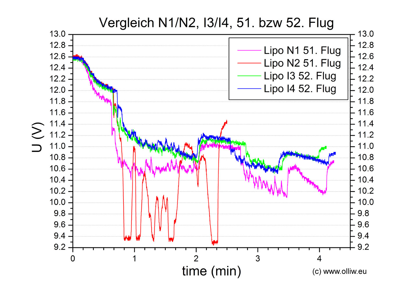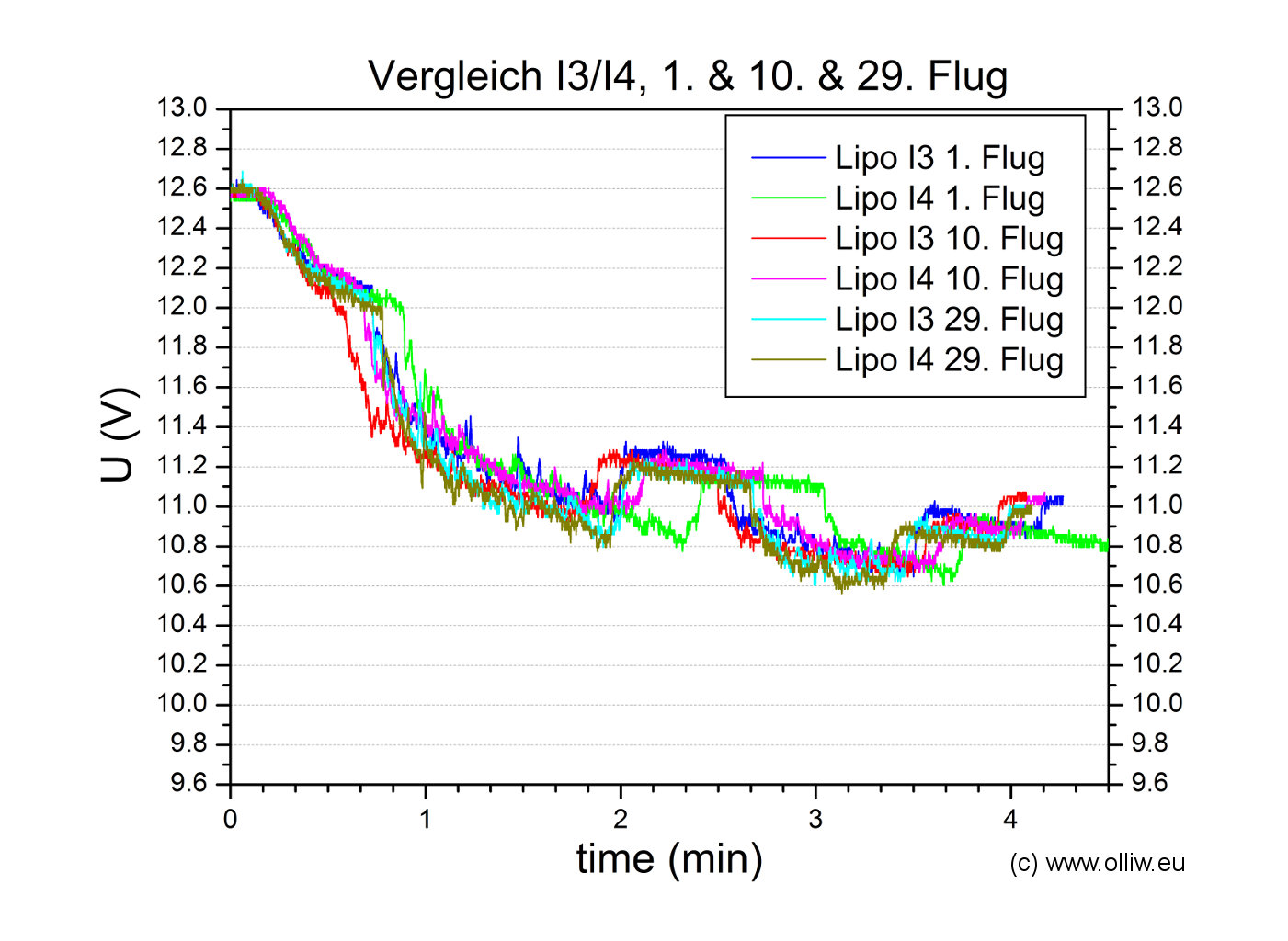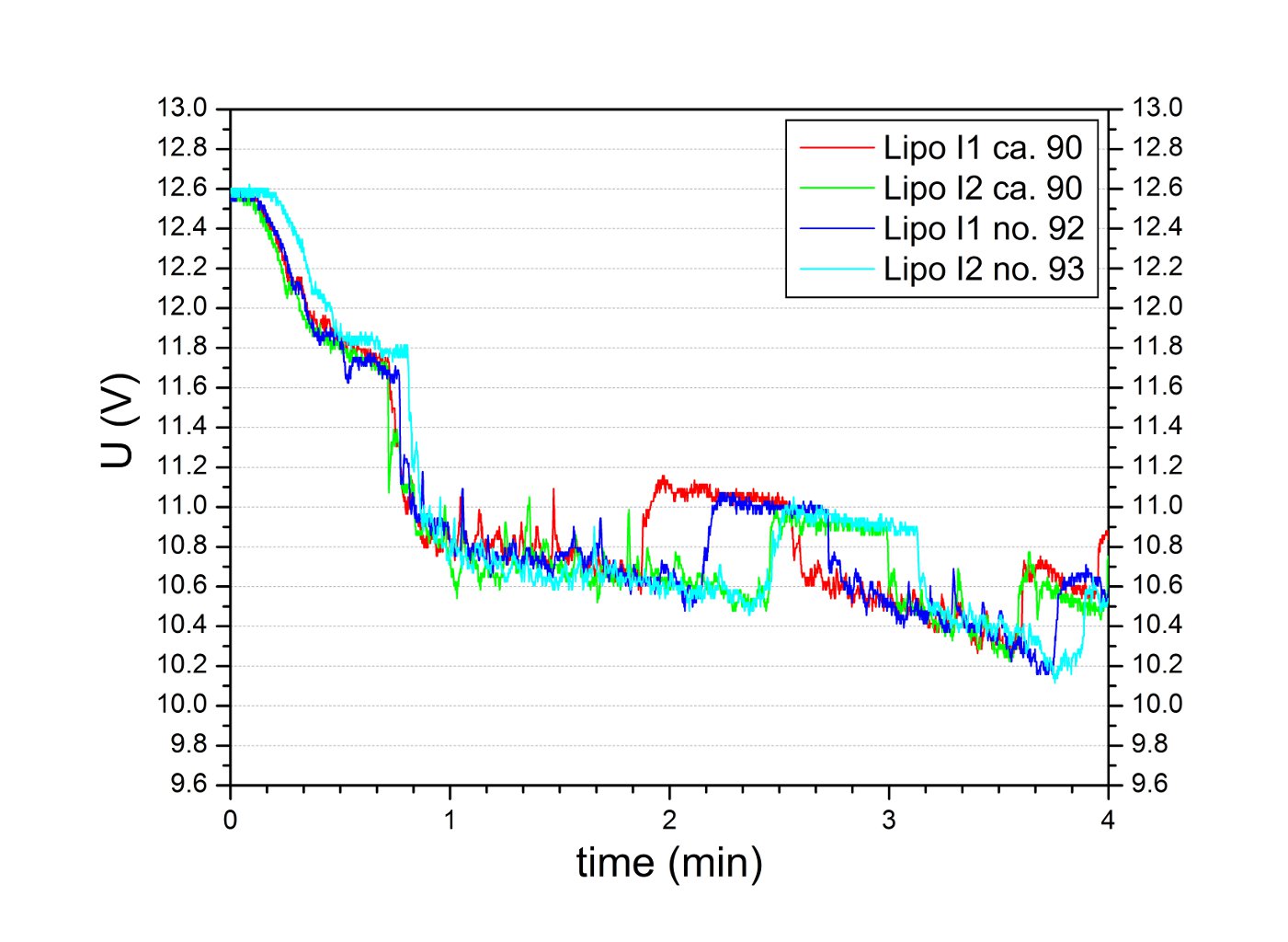 Zum Abschluss dieses ersten Eintrags möchte ich noch einen Vergleich der Spannungslagen für jeden Lipo des I1/I2 Pärchen für jeweils zwei Flüge zeigen. Die Ähnlichkeit der vier Messkurven ist offensichtlich, insbesondere auch im Hinblick auf den deutlichen Unterschied zu den Spannungskurven der neuen Lipopärchen, wie sie oben gezeigt wurden. Diese gute Reproduzierbarkeit deutet (hoffentlich :)) an, dass das gewählte Testverfahren sinnvolle Resultate liefern wird.