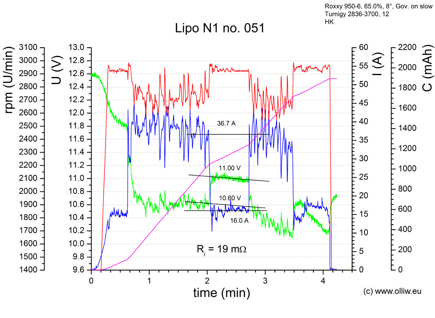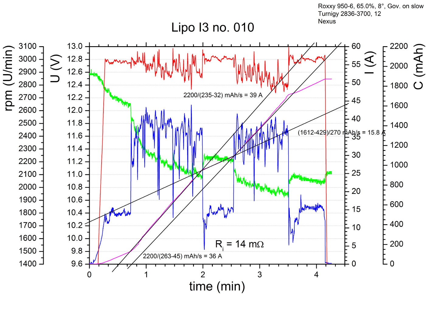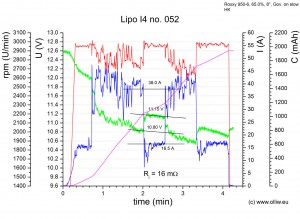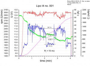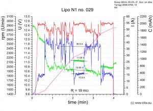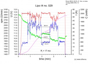 Diesem Protokoll liegen diese Überlegungen zu Grunde: Der einzige halbwegs wohldefinierte, gut reproduzierbare Flugzustand ist das Schweben. Im Schweben sollten sich daher aussagekräftige Messdaten erhalten lassen, z.B. bzgl. dem Verhalten der Spannungslage mit zunehmendem Alter. Allerdings gibt es ja noch andere interessante Eigenschaften, wie z.B. wie „Leistungsfähig“ der Akku noch ist, oder der Innenwiderstand. Dazu habe ich mir den Maximalpitchpowerflug ausgedacht, mit der Hoffnung das die Bedingung Dauervollpitch auch einen halbswegs wohldefinierten Flugzustand ergibt, welcher sinnvolle Aussagen über die „Leistungsfähigkeit“ erlaubt. Der Wechsel zwischen Maximalpitchpowerflug und Schweben ist dazu gedacht, den Innenwiderstand zu bestimmen. Den Maximalpitchpowerflug werde ich im folgenden mit MPP-Flug bezeichnen. Es fließen hierbei im übrigen etwa 35-40 A, entsprechend einer Dauerbelastung von 16-18 C…
