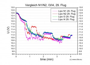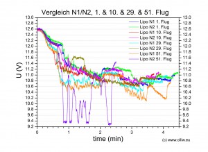 Gegenüber den oben gezeigten Daten sind nun einige Veränderungen zu sehen. Erstens, es scheint, dass sich die Innenwiderstände bereits langsam verschlechtern. Zweitens, die Turnigy Nanotech scheinen im Vergleich nun schlechter abzuschneiden. Insbesondere beim Lipo N1 ist anfänglich eine deutlich niedrigere Spannugslage zu beobachten (dies wird durch Daten für den 28. Flug bestätigt).