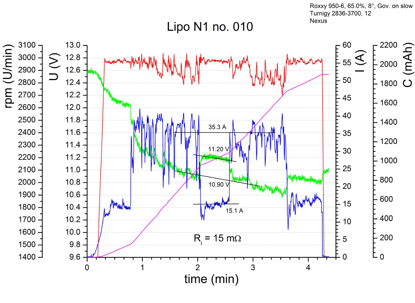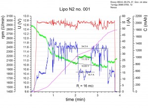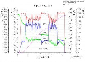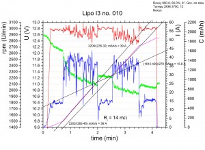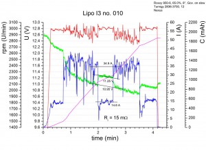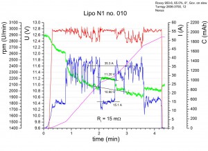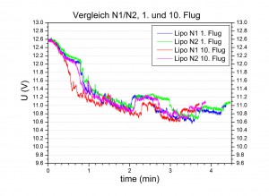 Die Lipos der Pärchen N1/N2 und I3/I4 haben nun alle mindestens 10 Flüge hinter sich gebracht, und 10 Flüge schien mir eine interessante Zahl um mal wieder die Eigenschaften der Lipos zu bestimmen. Hier nun also die Flugdaten für den 10. Flug: