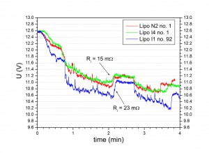 Ah… ich hab’s begriffen… die Angaben für den Innenwiderstand beziehen sich anscheinend immer auf EINE Zelle… bei drei Zellen in Reihe geschaltet erhöht sich dementsprechend natürlich dann der Wert um einen Faktor Drei. Das heisst, die oben bestimmten 15 mΩ für die neuen Pärchen rechnen sich um in etwa 5 mΩ/Zelle, was dann ganz gut passt. Meine Messmethode scheint also doch tatsächlich nicht ganz Unsinn zu sein :).