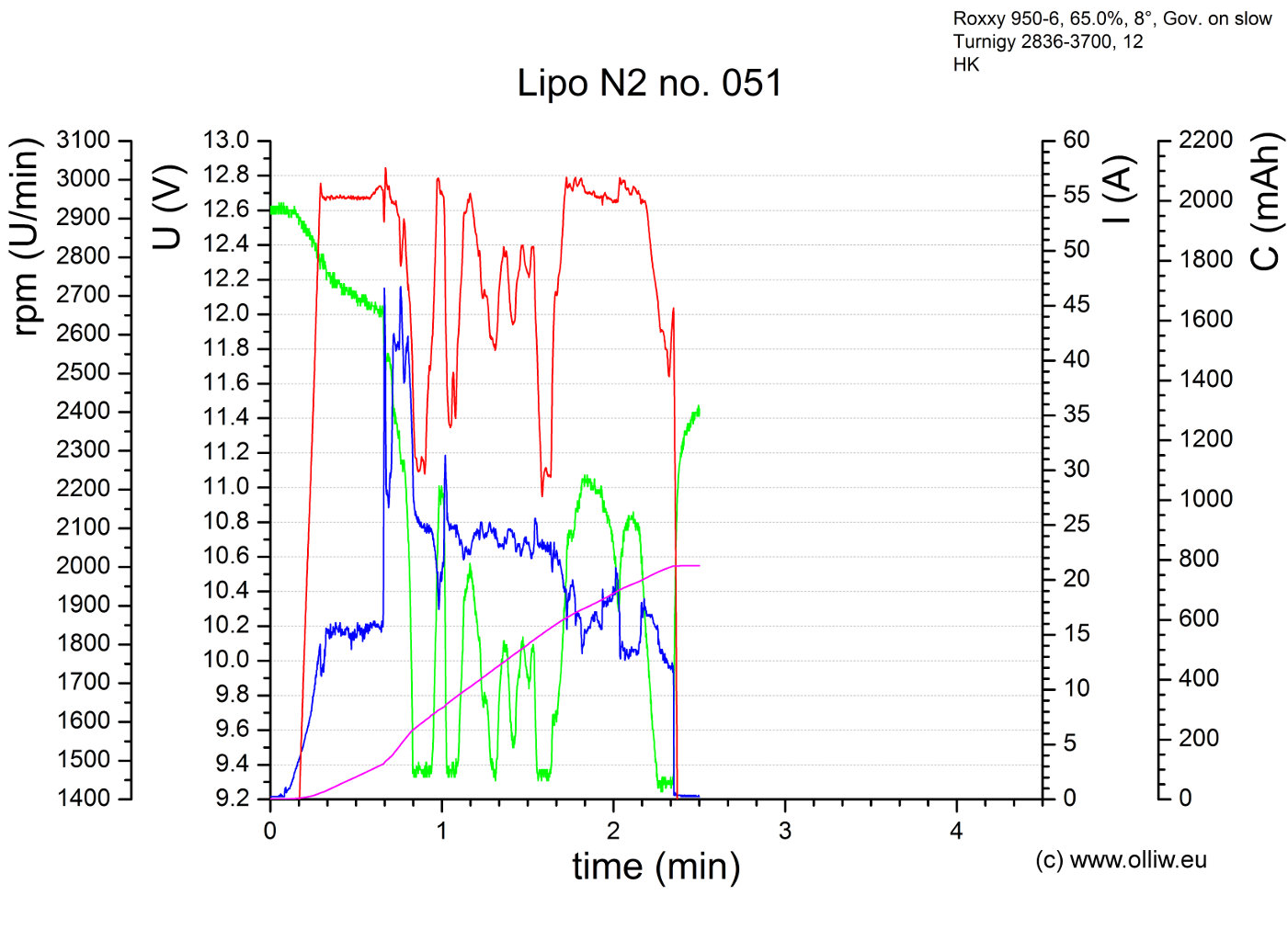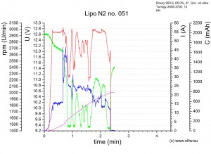 Die entscheidende Veränderung gegenüber Flug Nr. 29 ist, dass der Lipo N2 der Belastung eines MPP Flugs nicht mehr gewachsen ist. Kurz nach dem Vollpitch gegeben wurde brach die Leistung völlig ein, und ich konnte nur noch so ein bischen vorsichtig rumeiern, und nach ca. 2 1/2 Minuten bin ich dann sicherheitshalber gelandet weil ich das Gefühl hatte, dass der BESC abregelt. Wenn man sich die Aufzeichung ansieht… ist schon grass wie es dem Lipo quasi die Luft abschnürt. Zum so Rumfliegen und Üben von Flugfiguren (Rückenschweben :)) tut er’s noch, aber eigentlich muss man sagen, der Lipo N2 ist praktisch tod.