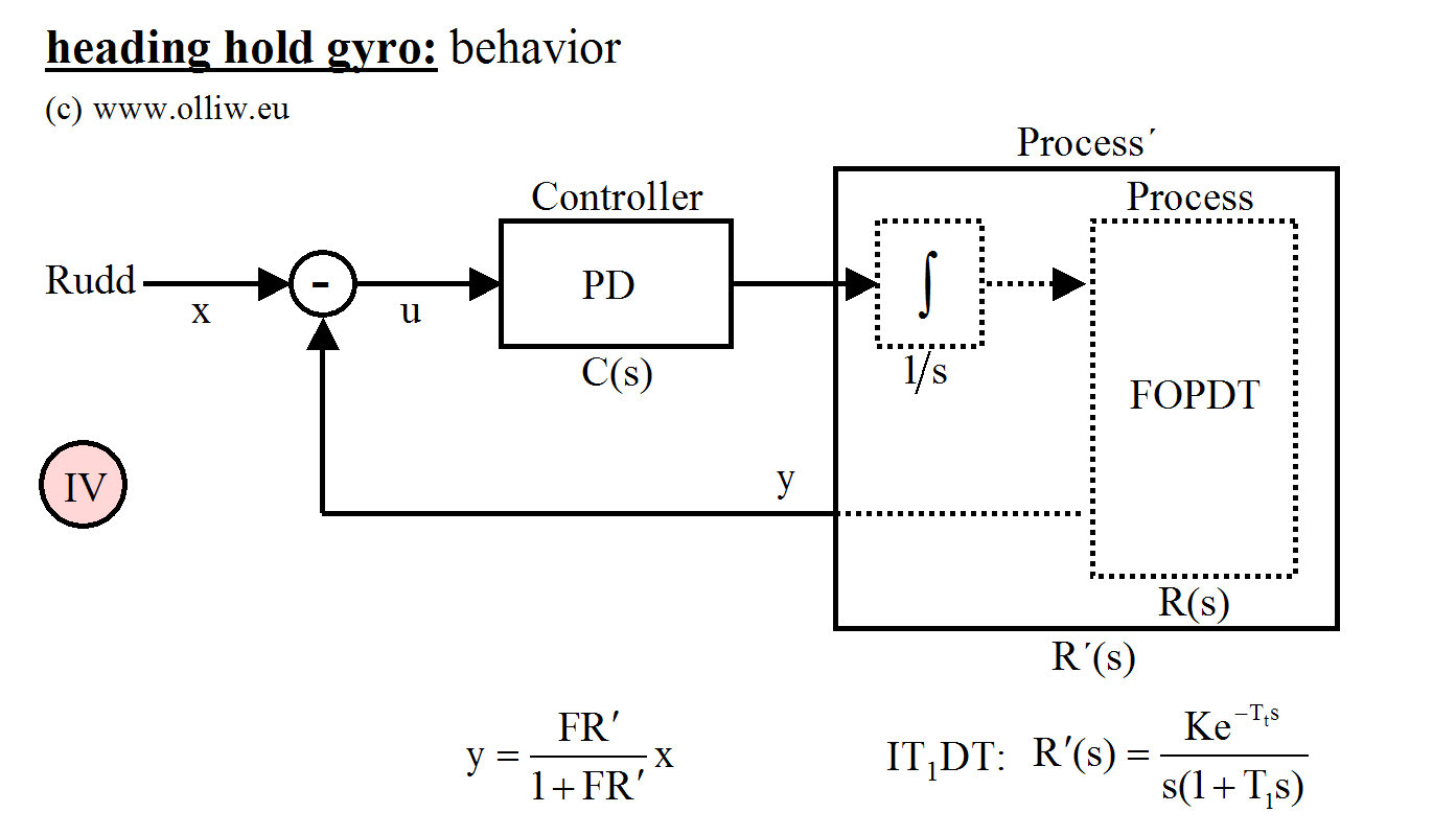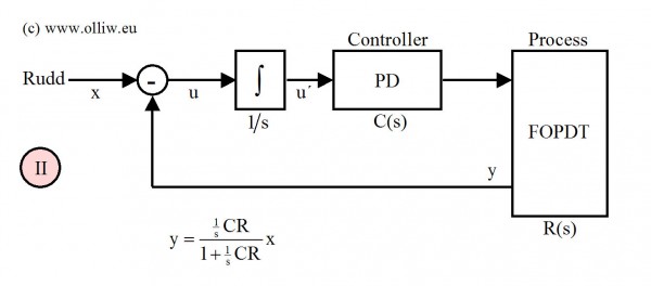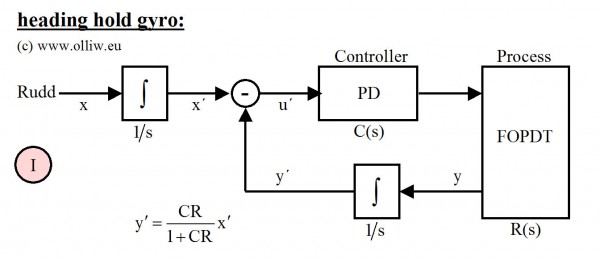 Hier wird also nicht der Regler verändert, es handelt sich nach wie vor um den selben PD-Regler wie in der ursprünglichen Struktur (I), und die P und D Parameter entsprechen genau dem Gewohnten und in jedem Standardtext zum Regler beschriebenen. Aber, und das ist nun entscheidend, die Regelstrecke hat sich verändert. Es handelt sich nun nicht mehr um eine Strecke mit Ausgleich, wie beim Rategyro oder den anderen obigen Reglerstrukturen, sondern um eine sogenannte Strecke ohne Ausgleich oder integrierende Strecke.
