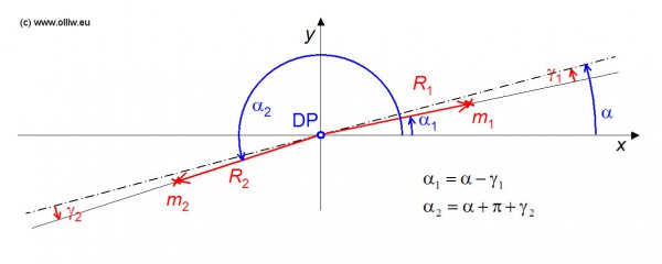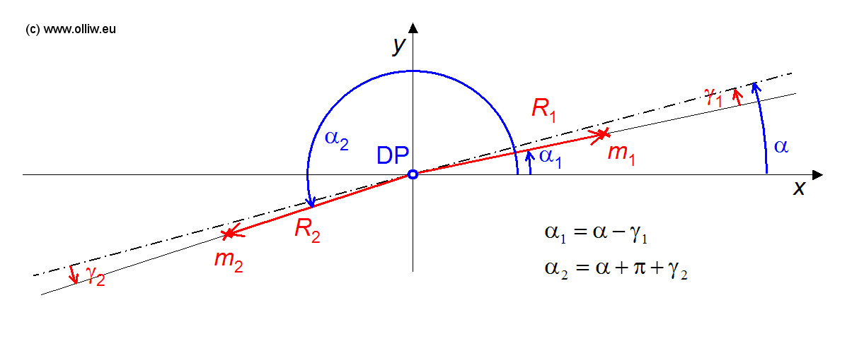 Das Ziel des Auswiegens scheint klar: Der Rotor soll so mit Tesa beklebt werden, dass er horinzontal stehen bleibt. Was heisst aber horinzontal? Nun, diese Frage wollen wir für einen Moment übergehen, und annehmen das es eine „Kante“ gibt an der wir uns orientieren können; diese Kante ist im folgenden Bild strich-gepunktelt dargestellt. Die Lage der beiden Schwerpunkte ist dann durch die Abstände
