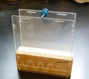 Die zweite Frage, welche Auswuchtmethode am geeignetsten ist, läßt sich dagegen gut beantworten. Betrachten wir zunächst das Ausbalancieren. Die Genauigkeit hängt hier einmal von der Reibung im Drehpunkt ab. Das spricht für Magnetlager. Für kleine Blätter ist das die ideale Wahl, aber vielleicht nicht nötig (kleine Blätter = Auswuchten weniger kritisch). Für größere Blätter werden Magnetlager schnell unrealistisch. Oft werden Kugellager benutzt, aber die sind sicher nicht ideal. Zumindest sollte die Welle dann nicht direkt am Kugellager aufliegen (wie bei vielen der „billigen“ Waagen) sondern über große Metallscheiben mit den Kugellagern in Verbindung stehen (wie bei dem in [5] benutzten DuBro 499 TruSpin Balancer). Am genauesten erscheint mir tatsächlich die einfachste aller Methoden, nämlich die Welle auf zwei Flächen aufzulegen, da hier nur der Rollwiderstand wirkt. Ösen (wie hier) oder gerundete Flächen (wie hier) sind weniger ideal, da zur Reibung noch potentielle Energie dazukommt, genausowenig wie gekrümmte Flächen (Becher, Gläser, Eierbecher, usw.). Gemeint sind also ebene, gerade Flächen. Klaro, die Flächen dürfen keine Dellen, Kratzer, Schriefen, Grate, usw. haben, und sollten möglichst waagrecht ausgerichtet sein. Dünne Flächen und Metall-auf-Metall sind auch vorteilhaft. Auf dem Netz gibt es wirklich viele einfache, billige, gute, kreative Lösungen. Solche Waagen erreichen auch eine erstaunliche Präzision. Also, man merkt’s, das ist IMHO die Lösung, und bei mir sieht das so aus wie im nachfolgenden Bild. Die Genauigkeit hängt weiterhin davon ab, wie genau die horizontale Lage des Rotors bestimmt werden kann. Auch dazu gibt es auf dem Netz gute Ideen. Aber halt! Wichtig ist das nur wenn der Drehpunkt nicht mit dem Schwerpunkt übereinstimmt (stabiles Verhalten), aber wir wollen ja ein neutrales Verhalten des Rotors erreichen! Dann ist eine genau Bestimmung der horizontalen Lage irrelevant, und das ist ein weiterer guter Grund für Methode B. Wir können eine weitere Schlussfolgerung ziehen: