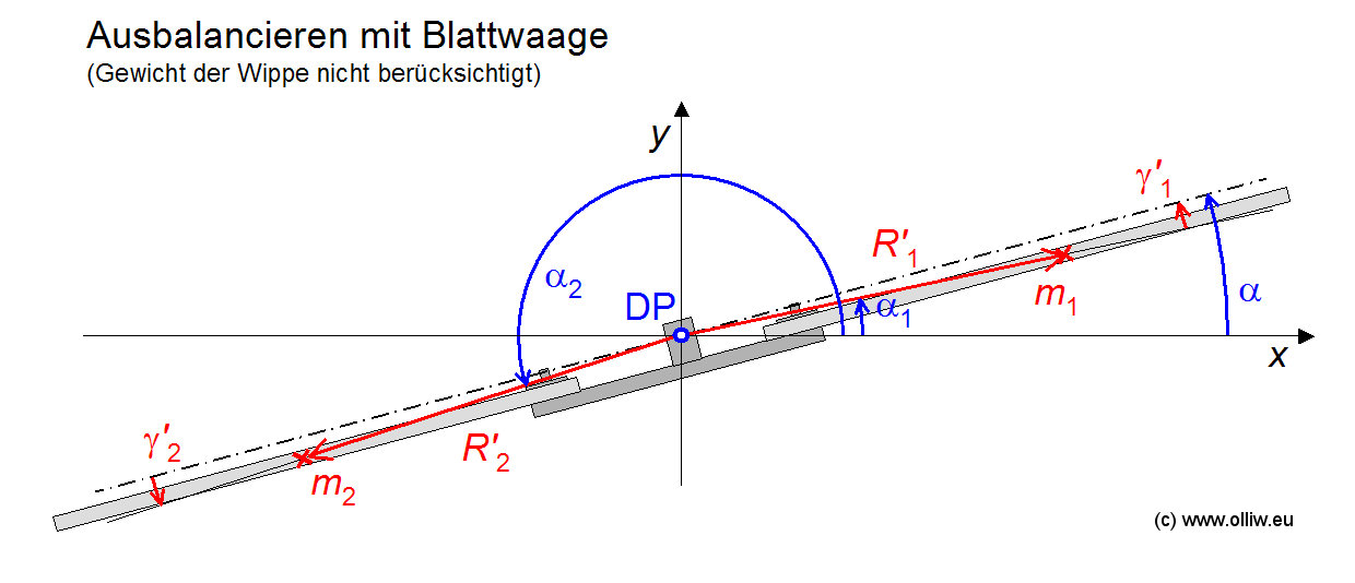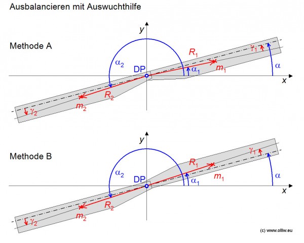 Es ist also nicht die einfache Fliehkraft-Bedingung Gl. (2.2) zu erfüllen, sondern Gl. (3.1). Blattwaagen, bei denen die Rotorblätter an einer Wippe aufgehängt werden (also so ein Teil wie z.B. hier), haben hier also gegenüber Auswuchthilfen (also so Teilen wie z.B. hier) einen gewissen Vorteil dahingehend, dass die Blatthalter-Länge zumindest in etwa mit berücksichtigt wird.