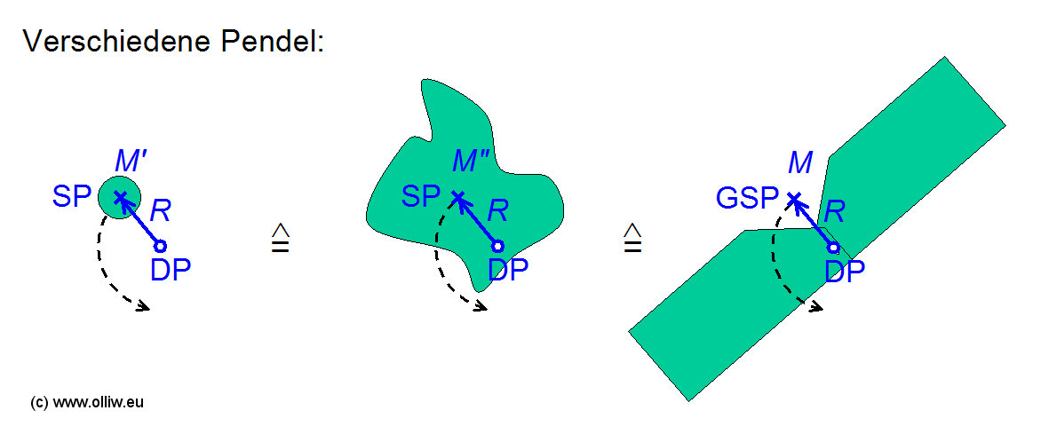 Die Masse braucht aber keine kleine Kugel sein, sondern kann irgend ein starrer Körper sein, wie z.B. der im Bild in der Mitte gezeigte Körper. Der Körper wird wieder nach unten fallen und solange schwingen bis er durch die Reibung zum Stillstand kommt, und der Schwerpunkt wieder exakt unterhalb des Drehpunkts liegt. Der Unterschied zum obigen Pendel besteht nur darin, dass die Schwingperiode nicht nur von der Pendellänge