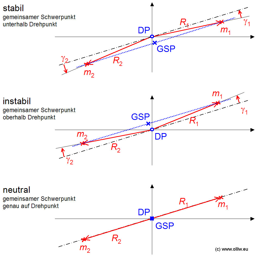 Grundsätzlich können nun drei Situationen unterschieden werden. Befindet sich der gemeinsame Schwerpunkt oberhalb des Drehpunkts, dann wird sich der Rotor nicht stabil einpendeln, sondern wird „umklappen“, so dass der gemeinsame Schwerpunkt unterhalb des Drehpunkts zu liegen kommt. Befindet sich der gemeinsame Schwerpunkt unterhalb des Drehpunkts, pendelt sich der Rotor in eine stabile Lage ein. Ein Sonderfall besteht wenn der gemeinsame Schwerpunkt mit dem Drehpunkt genau deckungsgleich ist. Dann wird der Rotor in jeder beliebigen Lage in Ruhe verharren, und nie pendeln! Wir merken uns also: