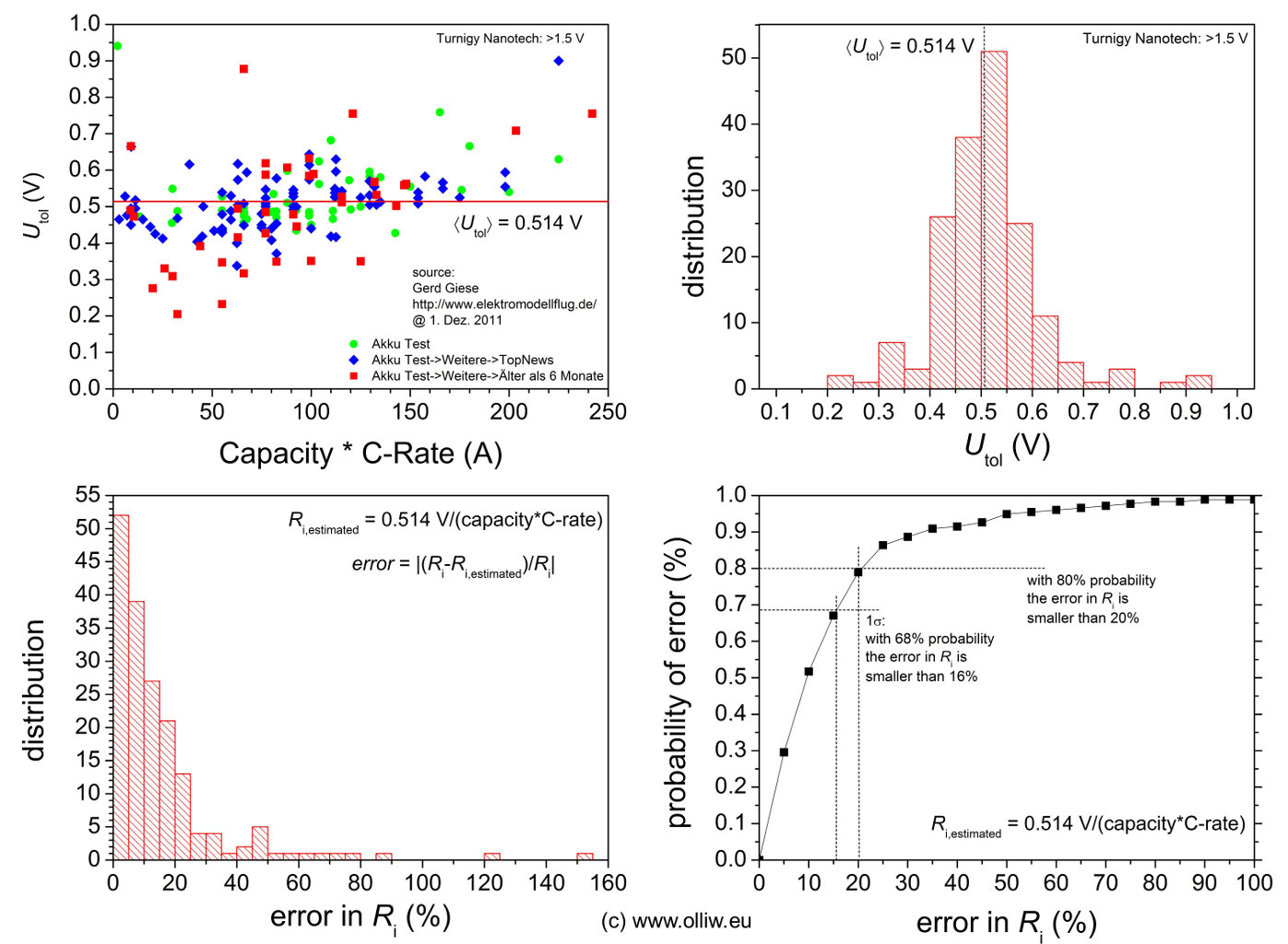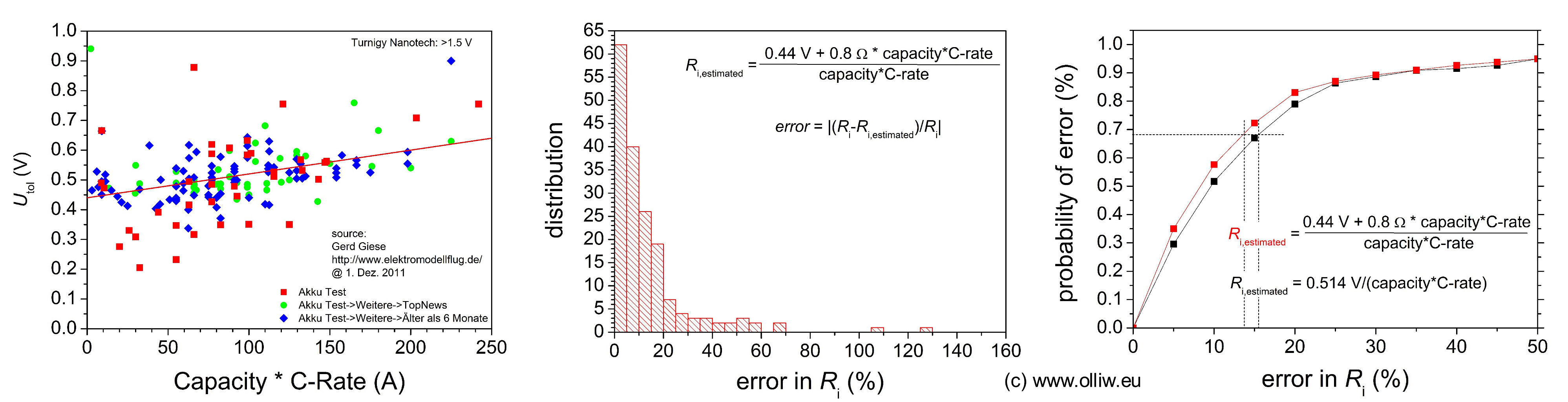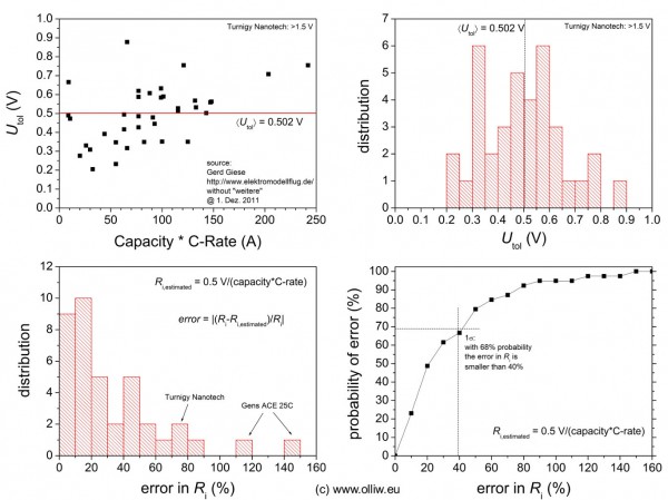 Oben links sind zunächst die aus den von Gerd gemessenen Innenwiderständen und den vom Hersteller angegebenen Kapazität und C-Rate über die obige Formel bestimmte