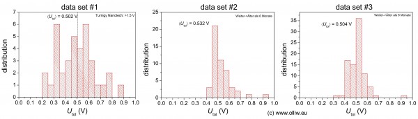 Diese Verteilungen sind schon recht „lustig“. Bemerkenswert ist das für alle drei der Mittelwert sehr nahe an den 0.5 V ist, obwohl die Verteilungen ja schon sehr unterschiedlich aussehen: die Erste ist breit, die Zweite nach rechts und die Dritte nach links verzogen. Das deutet an, dass der Wert