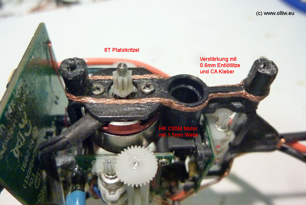 Und damit sind wir bei Hobbyking, denn das ist eigentlich die einzige Quelle die ich kenne bei dennen es einen für den mCPX tauglichen Motor zu vernünftigem Preis gibt, den C05M. Leider hat der eine 1.5mm Welle, womit wir wieder bei den Ritzeln sind. Glücklicherweise hatte helifreak-User stevebaker hier festgestellt, dass in den Plastikgetrieben der HXT900 Servos (und Ähnlichen) ein passendes 8T Ritzel drinnen ist. Und vom 450er hatte ich wahrlich noch genug alte HXT900 und TowerPro90; und das Ersatzgetriebe ist mit $0.89 nun auch nicht gerade teuer.
