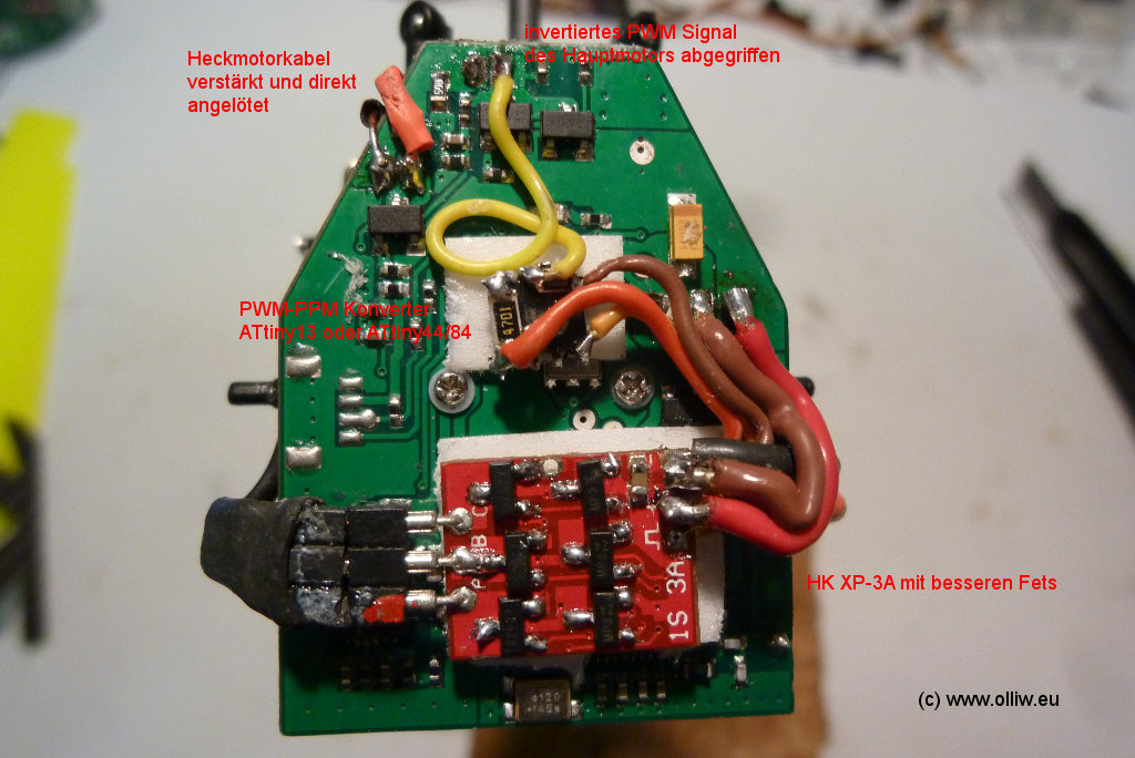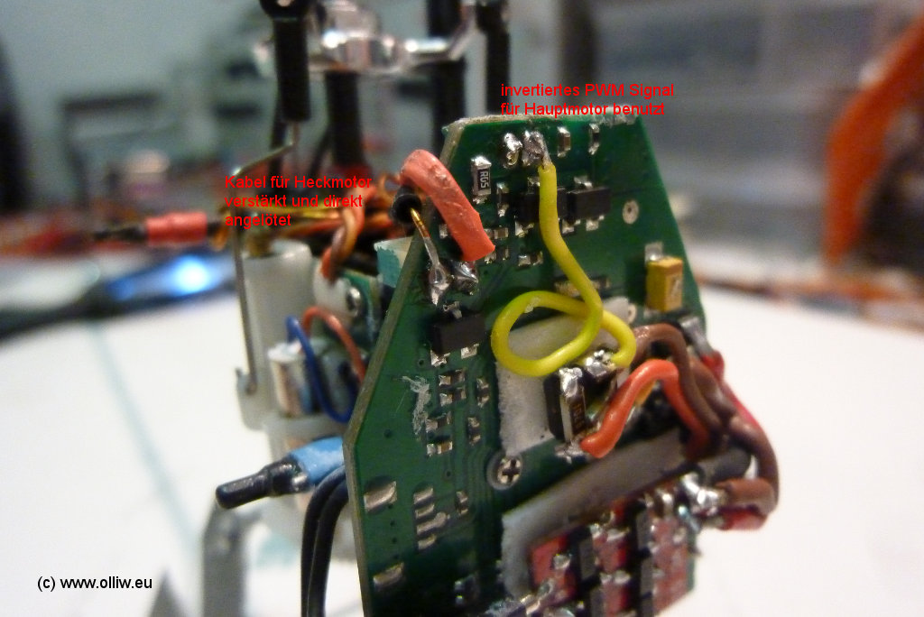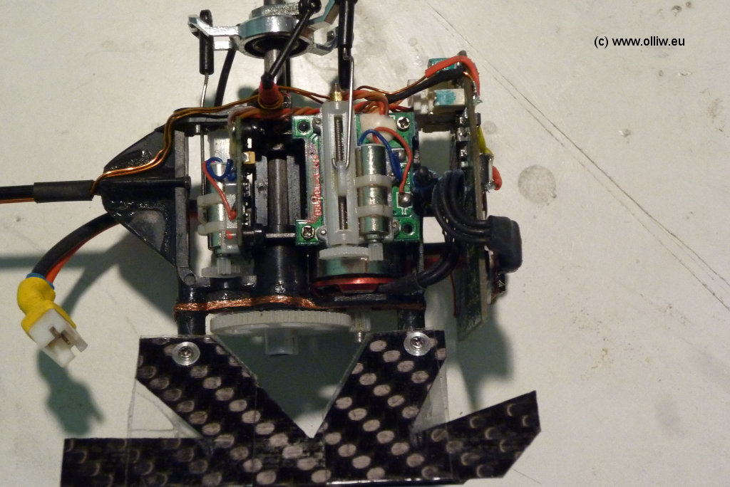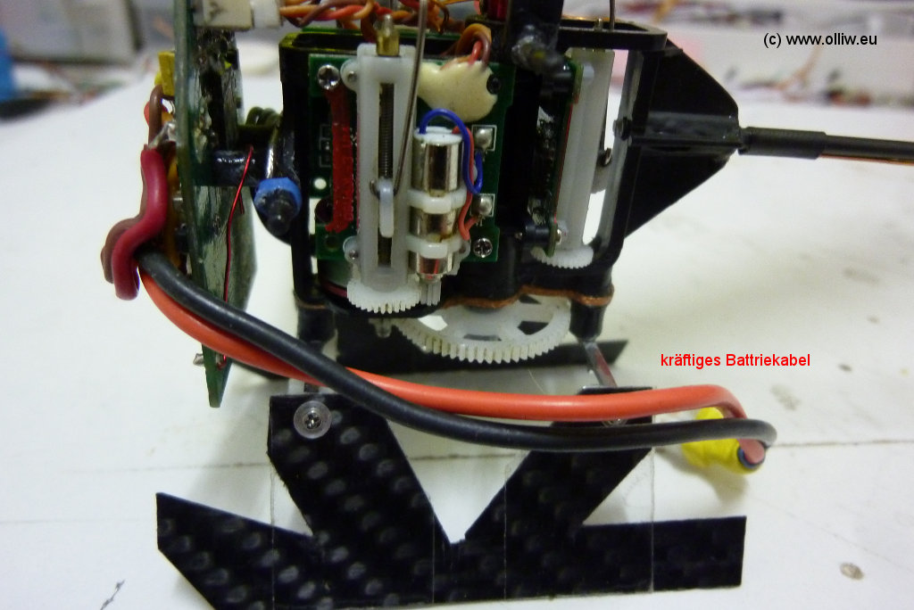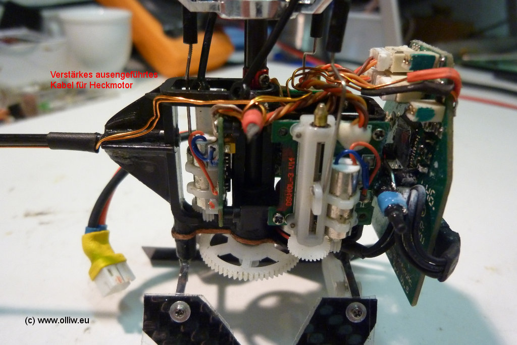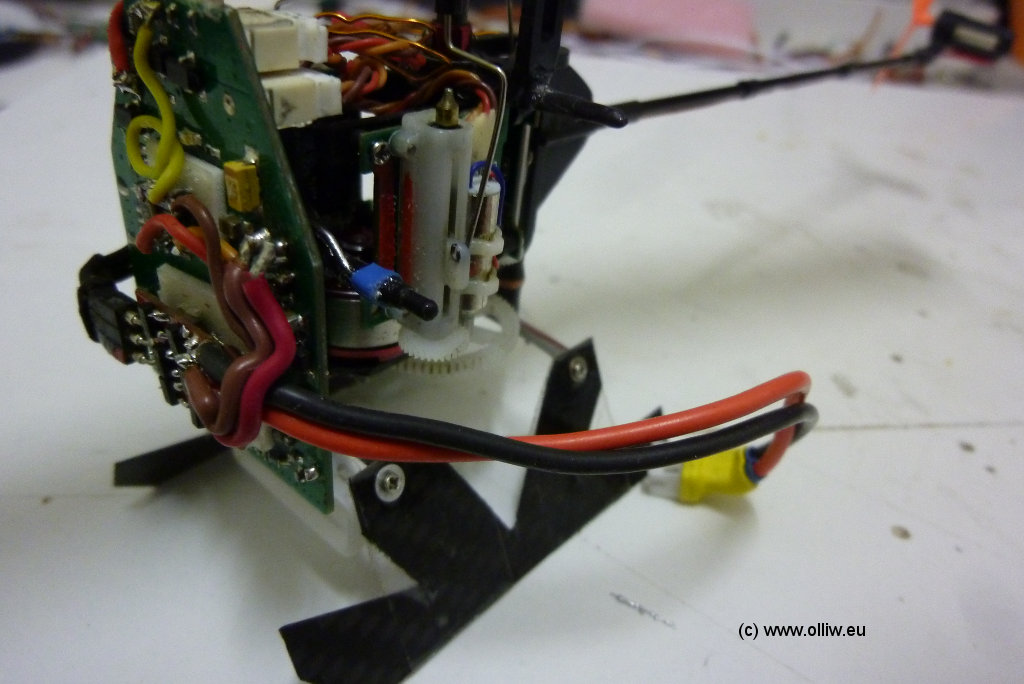Hinzu kommt noch eine Verlängerung des Hecks, um die Heckperformance zu steigern. Das bringt doch einiges. Bei mir ist die Länge 13.5 cm vom Heckmotor bis Ende des Hauptrahmens (16 cm Hauptwelle Mitte zu Heckrotor Mitte). Ich habe der besseren Robustheit wegen gleich ein 2 mm Vollcarbonrohr genommen, das hält super und ist mir noch nicht kaput gegangen. Die Kabel zum Heckmotor müssen dementsprechend aussen geführt werden. Ich habe bei der Gelegenheit gleich auch noch dickere Kupferlackdrähte (400 um) benutzt und diese direkt an das 3in1 Board angelötet. Das bringt spürbar etwas.