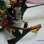 Ich habe den Konverter mit SMD-Teilen im „dead-bug“ Verfahren gebaut, was gegenüber Durchsteckbauteilen 1.0 g an Gewicht gebracht hat. Der Konverter wiegt nun, inkl. aller Kabel, gerade einmal 0.34 g. Die SMD Attiny13 gibt es gar nicht mehr so einfach, aber die konnte ich gleich bei Farnell für ca. 2.50Eur mitbestellen. Hinzu kommt noch ein 100uF Abblockkondensator und ein 10k Widerstand für den Resetpin (beides in SMD). Zu beachten ist, dass Quax’s Firmware mit invertierten PWM-Signalen arbeitet. Aber das war mir gerade recht. Ich habe dem Konverter einfach noch einen 100 Ohm Widerstand gegönnt, und so konnte ich das invertierte PWM-Signal am Motorstecker abgreifen, und brauchte nicht auf der Rückseite mit dem Löten rumfummeln. Viel einfacher so.