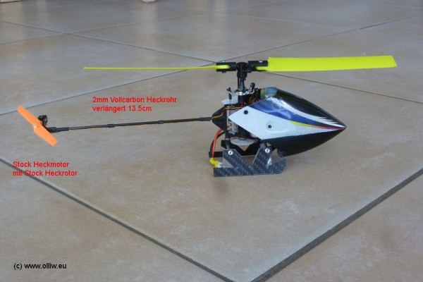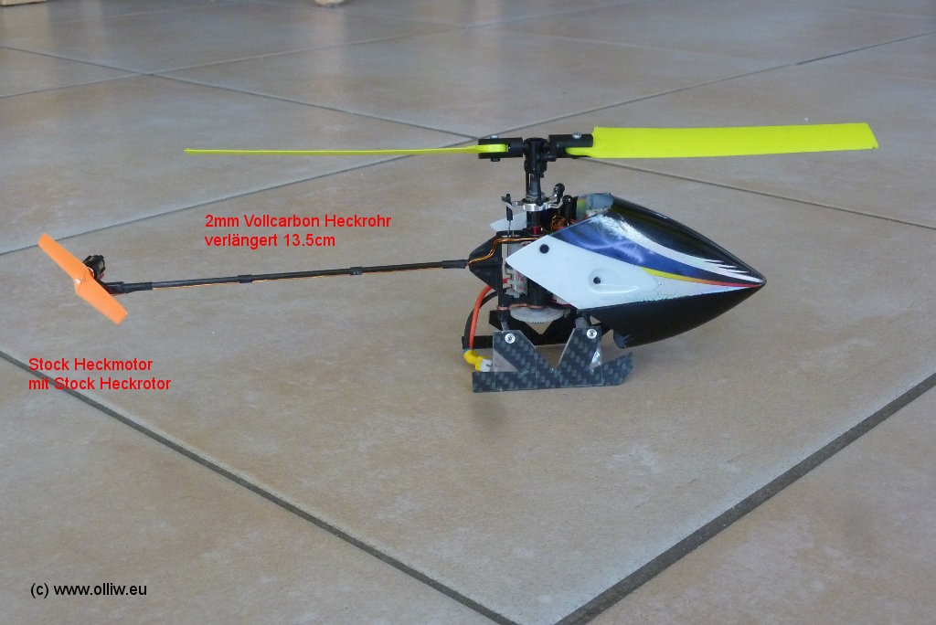 – verlängertes Heck, aus 1,0×2,0 mm Carbonrohr, z.B. Conrad für 500mm 3.95Eur (+Versand, am BEsten bei Gelegenheit mitbestellen)