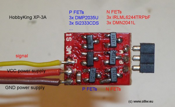 Bzgl. den BESC hatte ich mich früh darauf festgelegt, den XP-3A zu nehmen und dessen FETs gegen bessere zu tauschen… ich wollte es nicht nur billig sondern wenn möglich auch leicht… niedriges Gewicht ist auch ein Weg die Leistung zu erhöhen. Damit sind wir bei den FETs, denn das sonst üblicherweise vorgeschlagene Pärchen DMN2041/DMP2035 (siehe z.B. hier) ist in Deutschland für Hobbyisten nicht leicht zu bekommen, vorallem der DMN2041 nicht. Allerdings gibt es noch andere FETs, als Erstz für den DMP2035 wird oft der Si2333CDS vorgeschlagen, welcher aber deutlich „schlechter“ ist. Einen verfügbaren Ersatz für den DMN2041 zu finden war schwieriger; irgendwo/wie bin ich auf den IRLML6244TRPbF gestossen, der sogar noch besser als der DMN2041 ist. Alle vier FET-Typen sind bei RS verfügbar, aber Privatpersonen können dort nicht kaufen (:(). Farnell hat drei der Typen, aber auch dort muss man Geschäftskunde sein. Allerdings gibt es von Farnell den Privatkundenableger HBE, der jedoch nicht das gesammte Program hat.