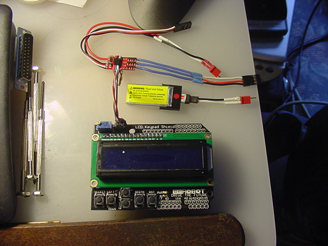 – Copperclad hat sich eine BLHeliBox aus einem Arduino Uno + LCD Shield zusammen gebastelt. Firmware flashen, zusammenstecken, 3 Kabel anlöten… fertig… siehe hier. Fehlt nur noch ein Hobbyking Stepup-Konverter (Turnigy Voltage Booster), dann wäre es 1000%ig perfekt! Hier ein Foto von Copperclad’s Aufbau: