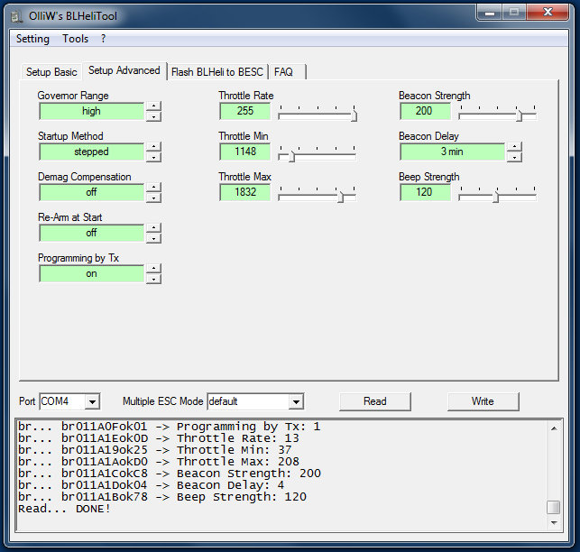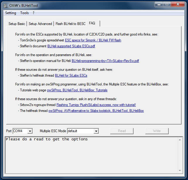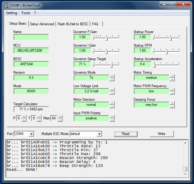 Hinweis: Ab Rev9.0 hängen einige der Defaultwerte nicht nur vom Mode (Main, Tail, Multi) sondern auch vom Typ des ESC ab… das wird (bisher) nicht in BlHeliTool berücksichtigt, d.h. beim Ausführen von ‚Default‘ werden für einige ESCs die Parameterwerte nicht auf die tatsächlichen Defaultwerte zurück gesetzt. Alle anderen Funktionen funktionieren ohne Einschränkung.