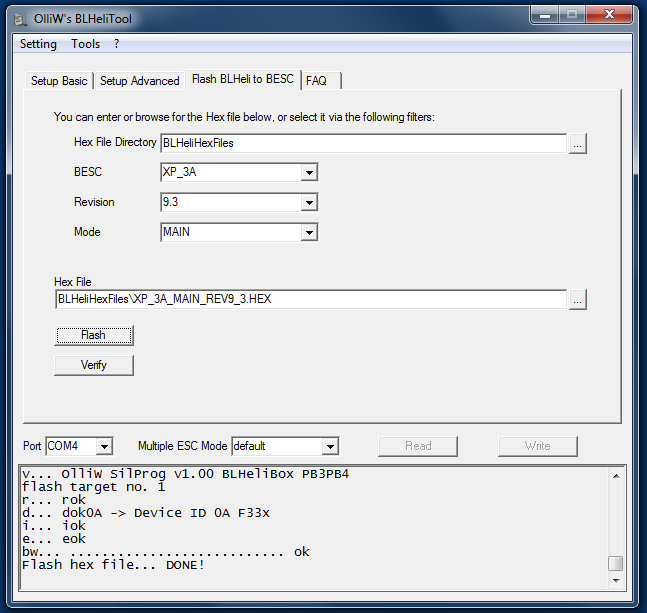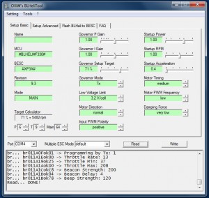 20. Jan. 2013: Service Update: (i) Unterstützung für BLHeli 9.4, (ii) BLHeliTool v1.01, COM Port endlich konform mit Windows, Flash weiter optimiert und dadurch erneute ehrhebliche Beschleunigung, (iii) BLHeliBox v1.01, Bug entfernt. Firmware-Update mit Beschreibung der Neuerungen wie immer unter Firmware. Die Tutorials sind nun auch vollständig an die Version v1.XX angepasst!