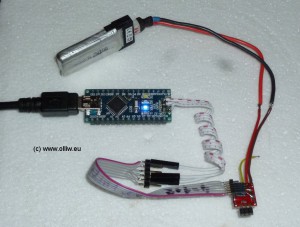 – So hat es angefangen, mein Test- und Entwicklungsaufbau. Arduino Pro Mini mit 328p, 3.3 V, 8 MHz mit USB-TTL FT2323RL Adapter zum Flashen eines BESC mit der BLHeli Firmware von sskaug. Dazu gibt es noch die Windows GUI BLHeliTool um die Parameter der BESC einzustellen. Das war wie gesagt nur mein Test/Entwicklungsaufbau, die Geschichte hat sich weiterentwickelt: Die bisher einfachste/billigste Lösung basiert auf einem Arduino Nano, wie oben beschrieben. Auch die nun verfügbare Software macht den Umbau jeden Arduinos zu einem owSilProg-Programmer zum Kinderspiel (siehe dieses Tutorial).
