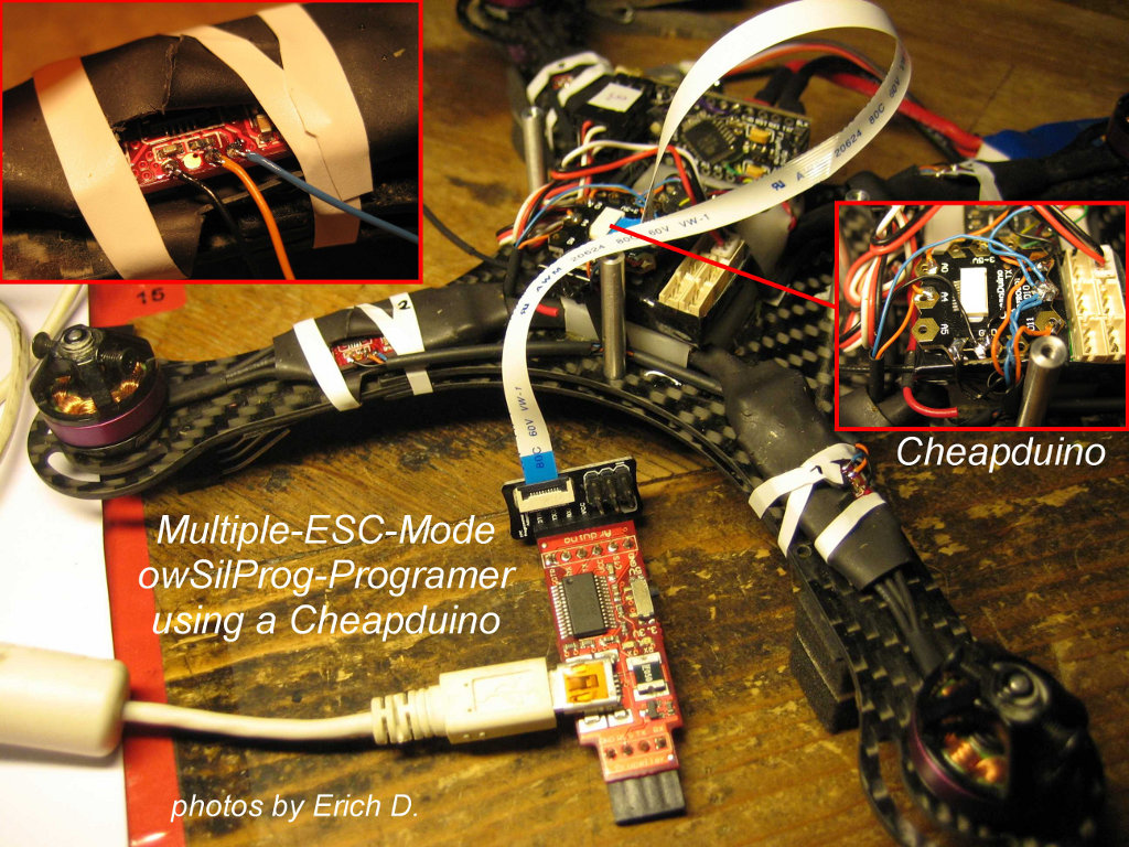 – Eric hatte die geniale Idee einen Cheapduino als Multiple-ESC-Mode fähigen owSilProg-Programmierer für seinen Quadrocopter zu verwenden! Spitze! (siehe auch hier)