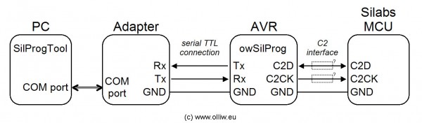 Das Konzept besteht also aus drei Komponenten, dem mit owSilProg geflaschten AVR, einem Adapter, und einem „Bedienprogram“. SilProgTool benutzt den COM Port, und das Blockschaltbild sieht dann so aus: