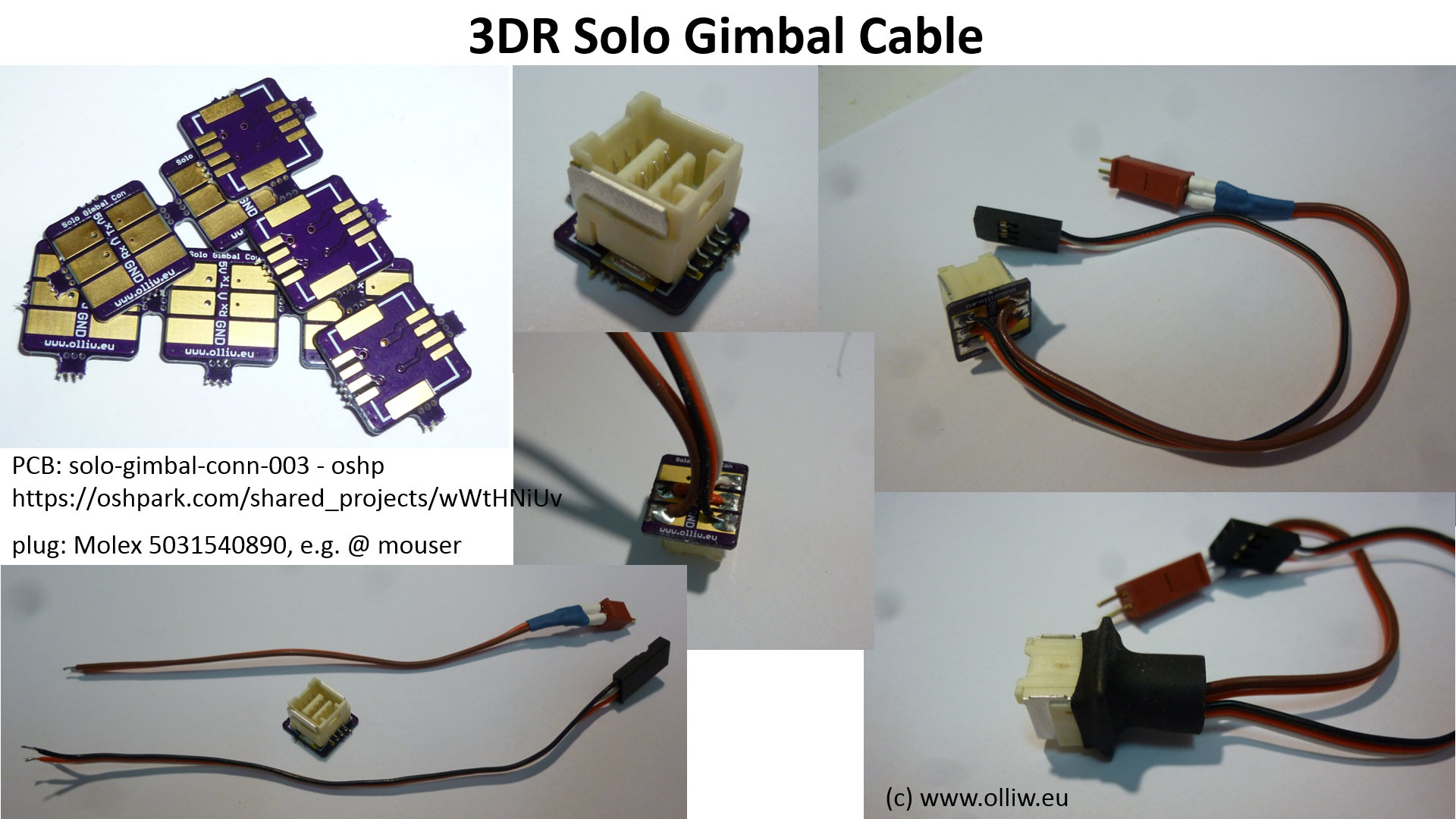 The gimbal cable in the Solo uses a really unusual connector, and connecting a third-party gimbal, such as a STorM32, can be a real pain because of that. I initially cut through some wires and extended them, which of course worked, but was ugly. So, I designed a small PCB, which yielded a nice adapter cable, which directly fits to my STorM32 gimbals.