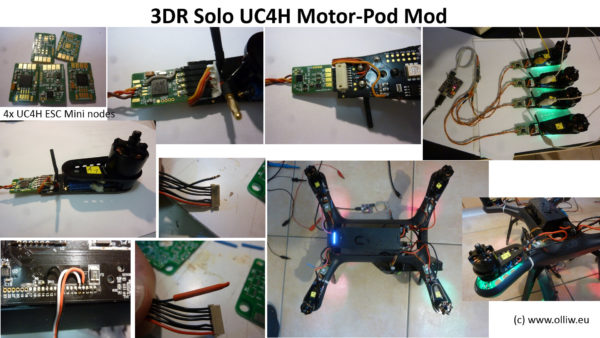 The Solo’s infamous „motorpod issue“ prevents us from flashing the stock Solo with the ArduCopter code, since a code piece introduced by 3DR in their firmware version to account for the „motor pod“ issue has not been taken over. Various „mods“ such as installing the green Cube or the infamous level-shifter mod are known. I use the UC4H ESC mini modules as converters from UAVCAN to PWM, which when installed close to the motor pods and connected properly, feed them with nice and clean 3.3 V PWM signals, overcoming the issue.