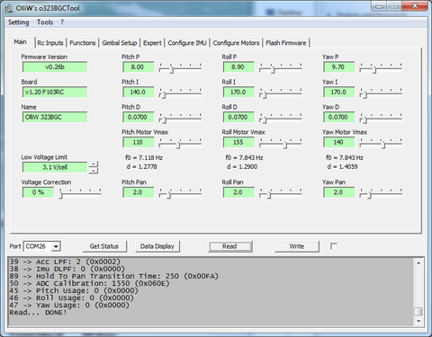 The o323bgc firmware provides also the parameters [Pan], [Voltage Correction], and [Hold To Pan Transition Time]. These are however not relevant for the basic tuning, and [Pan] should in fact be deactivated for tuning.