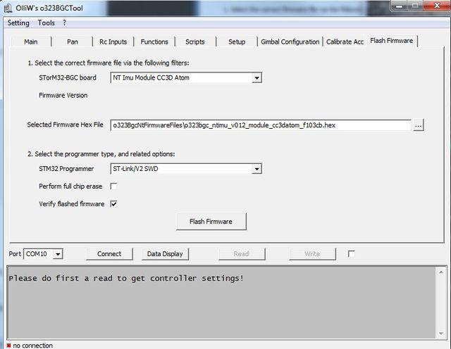 4. In the STorM32 GUI select the Flash Firmware Tab and set the fields as shown below: