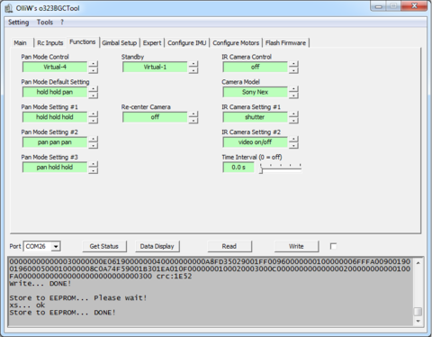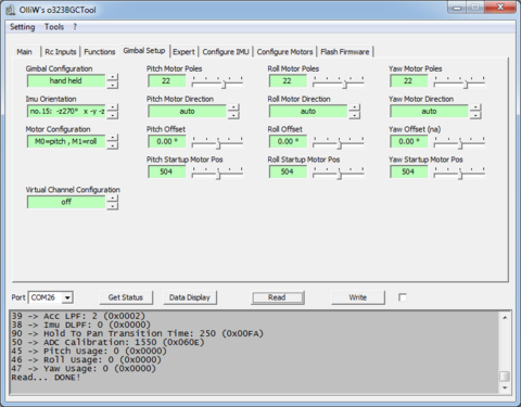 And then there is the [Gimbal Setup] tab, the [Gimbal Configuration] field where you can choose between "copter" and "hand held". This setting has actually nothing to do with the stabilizing of the gimbal as such at the moment, it is more meant as a global switch to turn on and off functionality that does not make sense in the one or the other case. In "copter" mode for example the standby switch is turned off to avoid any accidents.
