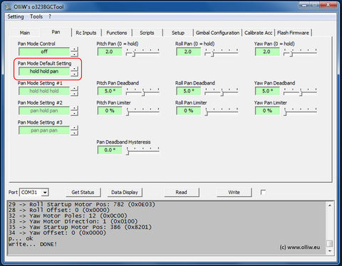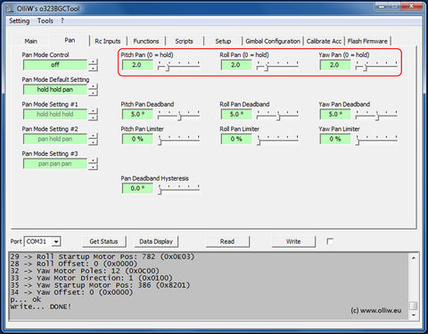 The obvious next question would be how the controller differentiates between unwanted shakes versus true movements? In the [Pan] tab the parameters Pitch Pan, Roll Pan and Yaw Pan are found, with which you determine the follow speeds in pan mode for each axis. A zero means that the follow speed is zero, which effectively corresponds to hold mode. A non-zero value enables the pan mode, whereby a larger pan value means a faster following.