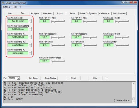 The STorM32 controller provides further powerfull options to adjust the pan behavior, namely the Pan Deadband, Pan Limiter, and Pan Deadband Hysteresis parameters. The first two can be set for each axis individually, while the last is for all three axes. These settings are effective only when the respective axis is in pan mode; they do not affect the hold mode.
