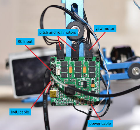 - Connect the STorM32 board via USB to the computer. We are not using this connection yet, but we power the board via USB.