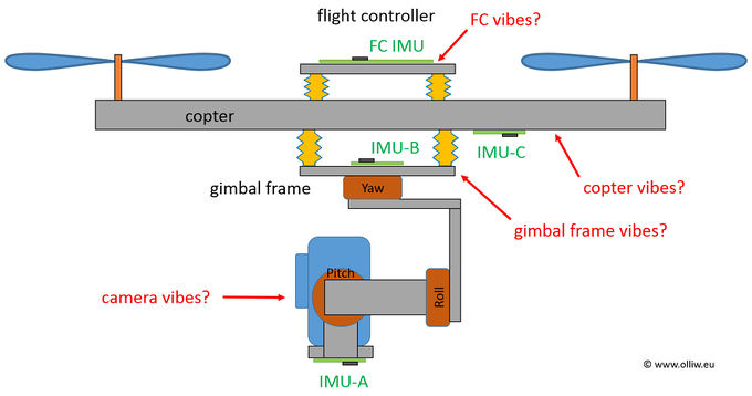 Flight controller often provide options for analyzing the copter's vibrations. However, the limitation is obvious: In most cases it does not see the real copter vibrations, since it is mounted with some dampers to the copter. Also, what matters to us are the vibrations at the camera, which is "far away" from the flight controller. That is, in a technical language, the transfer functions for the copter's vibrations to the flight controller and to the camera are substantially different. For a complete vibration analysis one needs to know the vibrations on the copter, on the gimbal frame, and the camera. It is pointed out that only with knowing the vibrations on the copter and the gimbal frame, the performance of a gimbal damping system can actually be assessed.