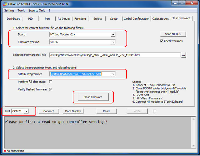5. In the STorM32 GUI go to the [GUI:Flash Firmware] tab and choose your settings: