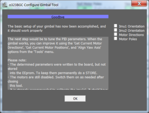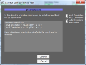 Now it's time to set the most important parameters, namely the IMU orientations and motor parameter values. Without that the controller can't perform the basic operations even. With the [GUI:Configure Gimbal Tool] this is very simple.